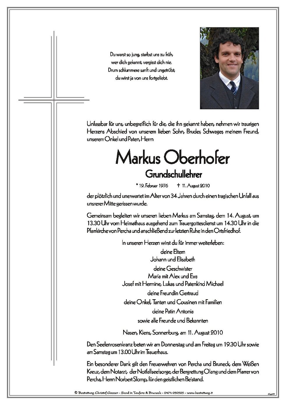 Gemeinsam begleiten wir unseren lieben Markus am Samstag, dem 14. August, um 13.30 Uhr vom Heimathaus ausgehend zum Trauergottesdienst um 14.30 Uhr in die Pfarrkirche von Percha und anschließend zur letzten Ruhe in den Ortsfriedhof.
