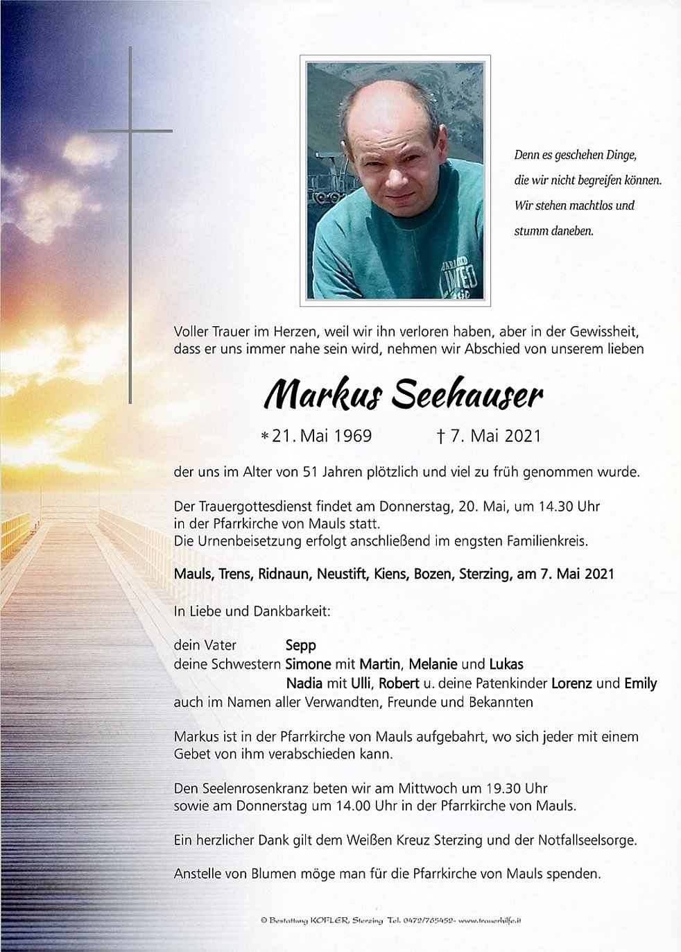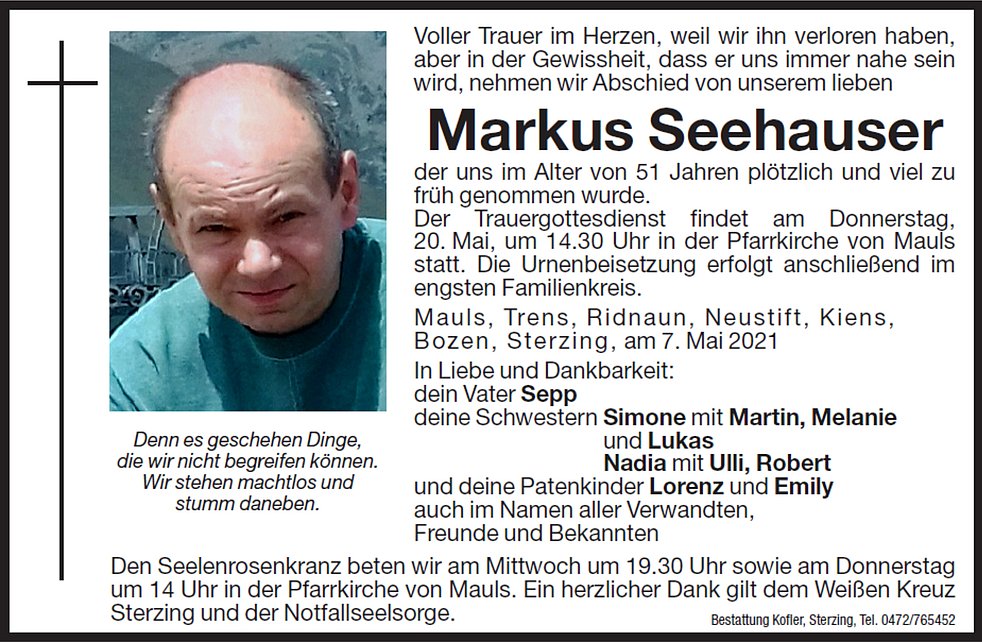 Der Trauergottesdienst findet am Donnerstag, 20. Mai, um 14.30 Uhr in der Pfarrkirche von Mauls statt. Die Urnenbeisetzung erfolgt anschließend im engsten Familienkreis.