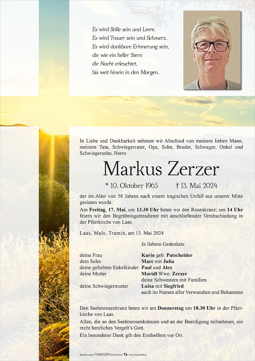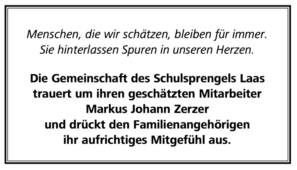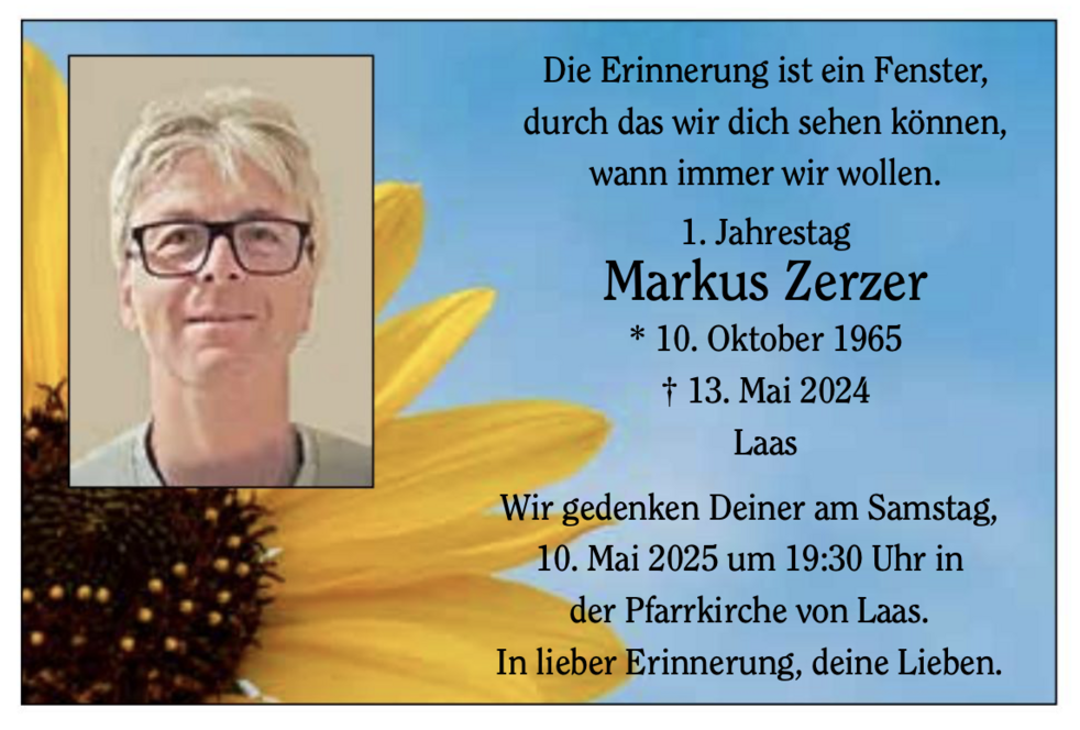 Am Freitag, 17. Mai, um 13.30 Uhr beten wir den Rosenkranz; um 14 Uhr feiern wir den Begräbnisgottesdienst mit anschließender Verabschiedung in der Pfarrkirche von Laas.