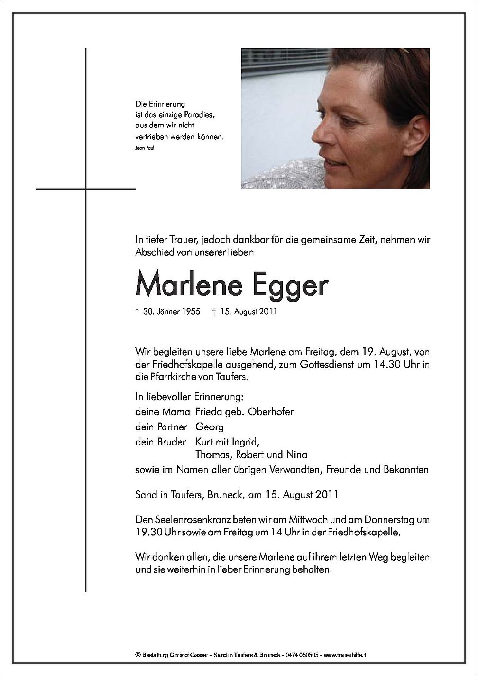 Wir begleiten unsere liebe Marlene am Freitag, dem 19. August, von der Friedhofskapelle ausgehend, zum Gottesdienst um 14.30 Uhr in die Pfarrkirche von Taufers.