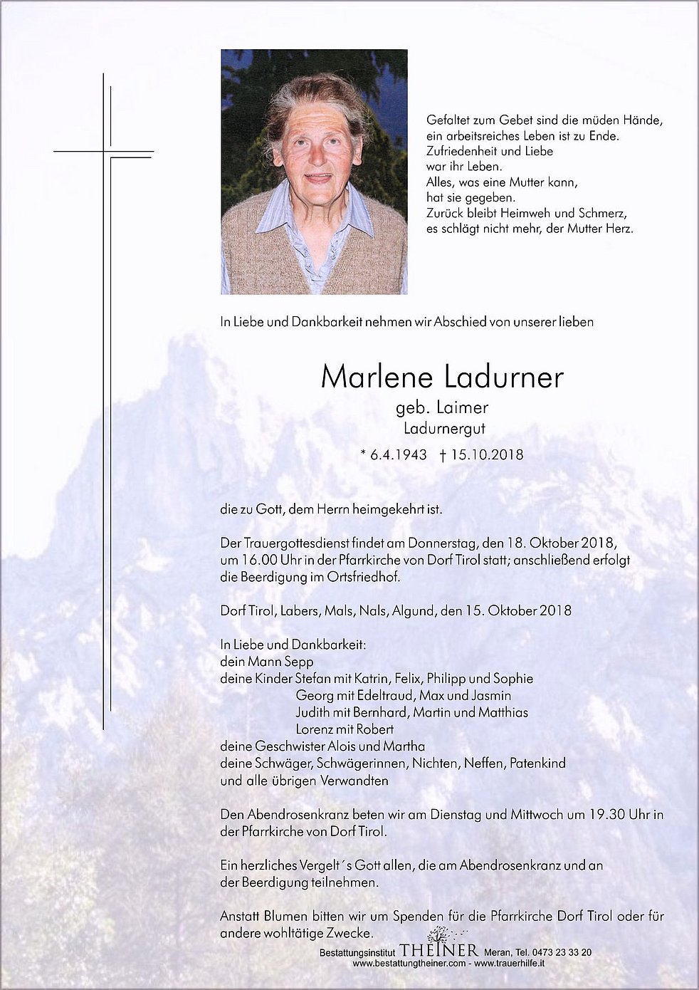 Der Trauergottesdienst findet am Donnerstag, den 18. Oktober 2018, um 16.00 Uhr in der Pfarrkirche von Dorf Tirol statt; anschließend erfolgt die Beerdigung im Ortsfriedhof.