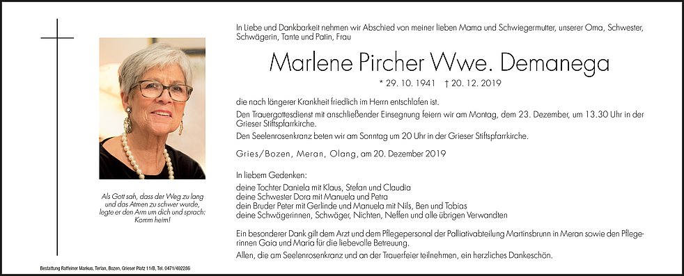 Den Trauergottesdienst mit anschließender Einsegnung feiern wir am Montag, dem 23. Dezember, um 13.30 Uhr in der Grieser Stiftspfarrkirche.