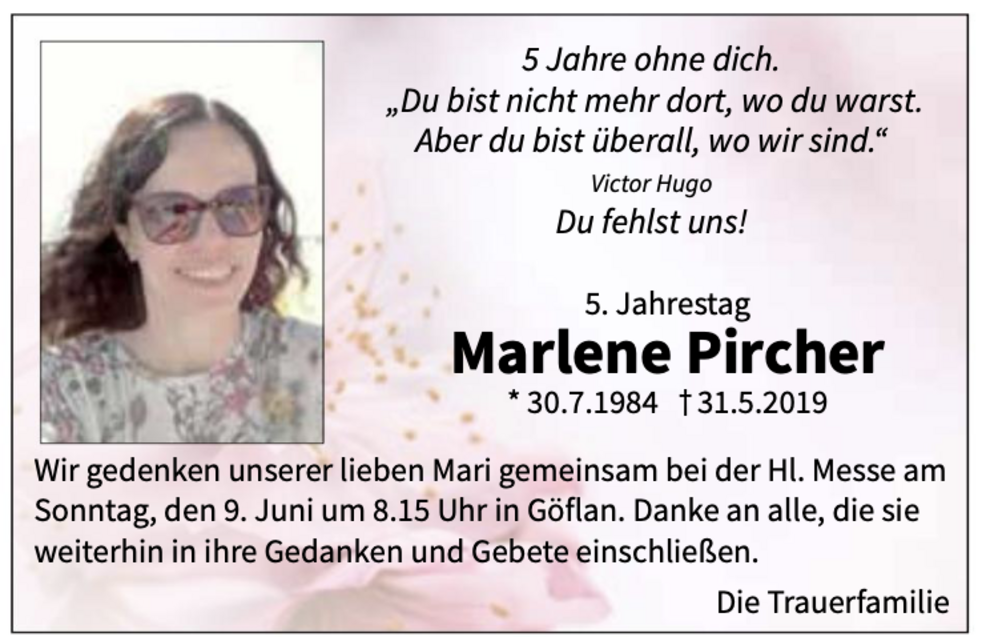 Wir begleiten unsere liebe Marlene am Montag, 3. Juni, um 14 Uhr vom Trauerhaus (Mairhof) aus zum Begräbnisgottesdienst in die St.-Martin-Kirche und anschließend zur letzten Ruhe auf den Ortsfriedhof von Göflan.