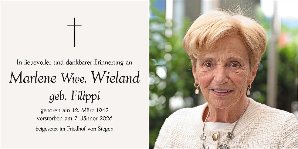 Wir verabschieden uns von ihr am Freitag, dem 9. Jänner, beim Gottesdienst um 15.30 Uhr in der Pfarrkirche von Stegen.