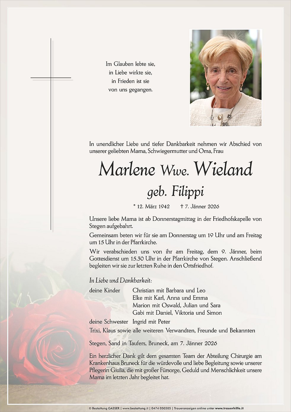 Ein herzlicher Dank gilt dem gesamten Team der Abteilung Chirurgie am Krankenhaus Bruneck für die würdevolle und liebe Begleitung sowie unserer Pflegerin Giulia, die mit großer Fürsorge, Geduld und Menschlichkeit unsere Mama im letzten Jahr begleitet hat.