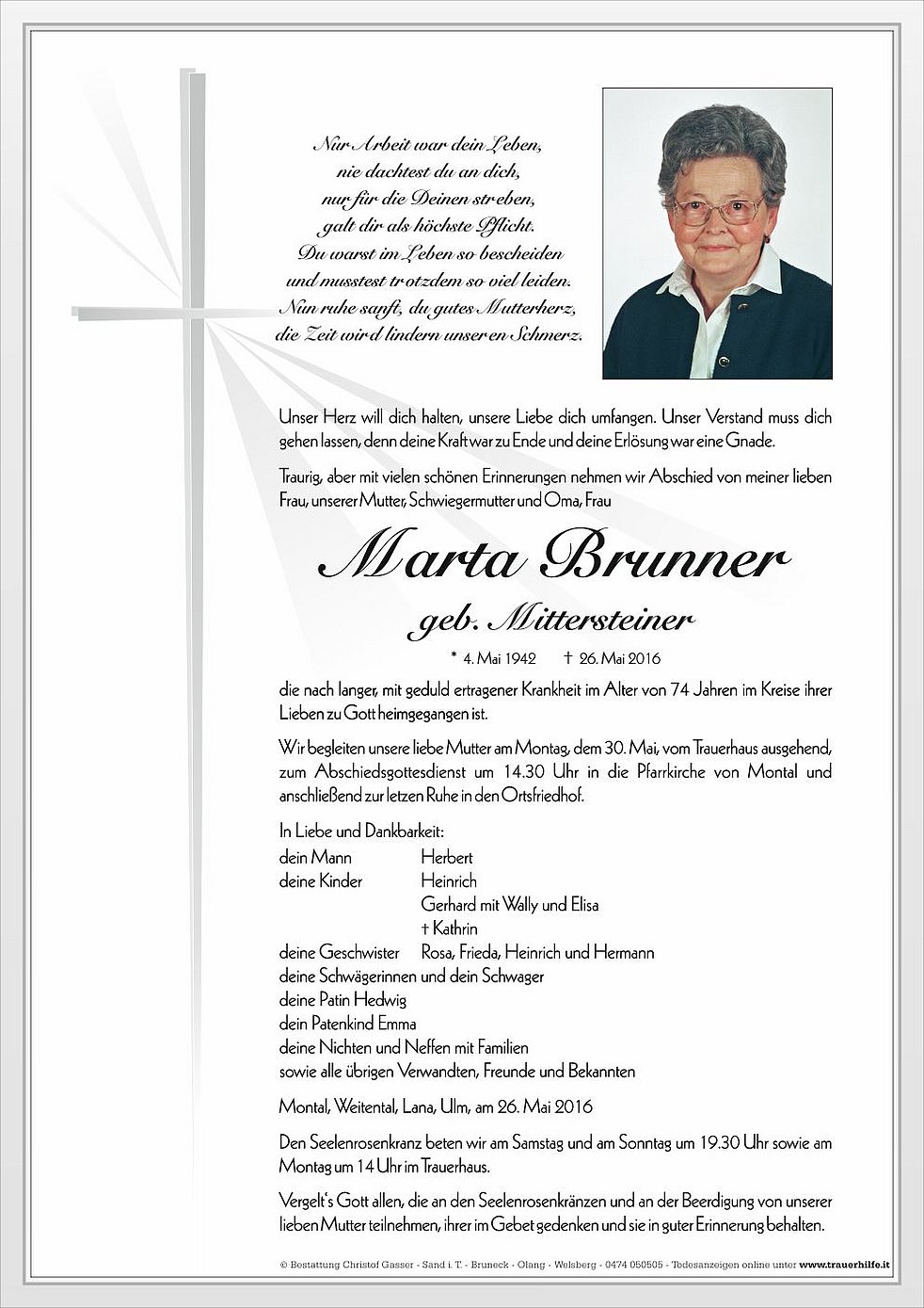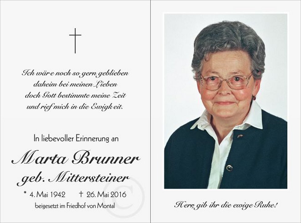 Wir begleiten unsere liebe Mutter am Montag, dem 30. Mai, vom Trauerhaus ausgehend, zum Abschiedsgottesdienst um 14.30 Uhr in die Pfarrkirche von Montal und anschließend zur letzen Ruhe in den Ortsfriedhof.