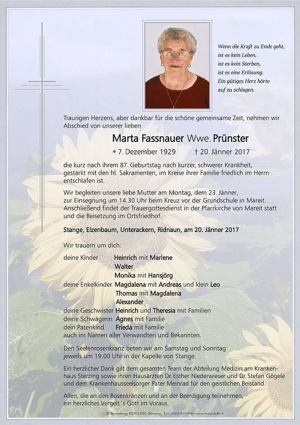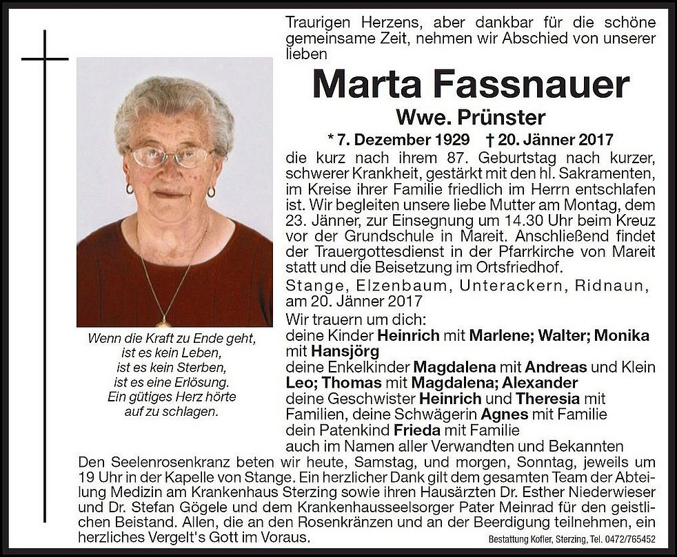 Ein herzlicher Dank gilt dem gesamten Team der Abteilung Medizin am Krankenhaus Sterzing sowie ihren Hausärzten Dr. Esther Niederwieser und Dr. Stefan Gögele und dem Krankenhausseelsorger Pater Meinrad für den geistlichen Beistand.