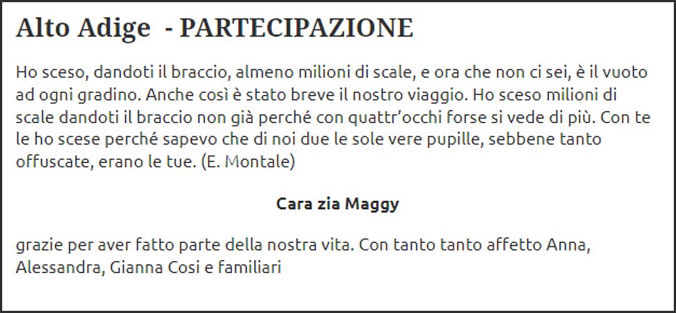 La S. Messa in suffragio con successiva benedizione verrà celebrata venerdì 1 aprile alle ore 14.00 nella chiesa Tre Santi a Bolzano.
