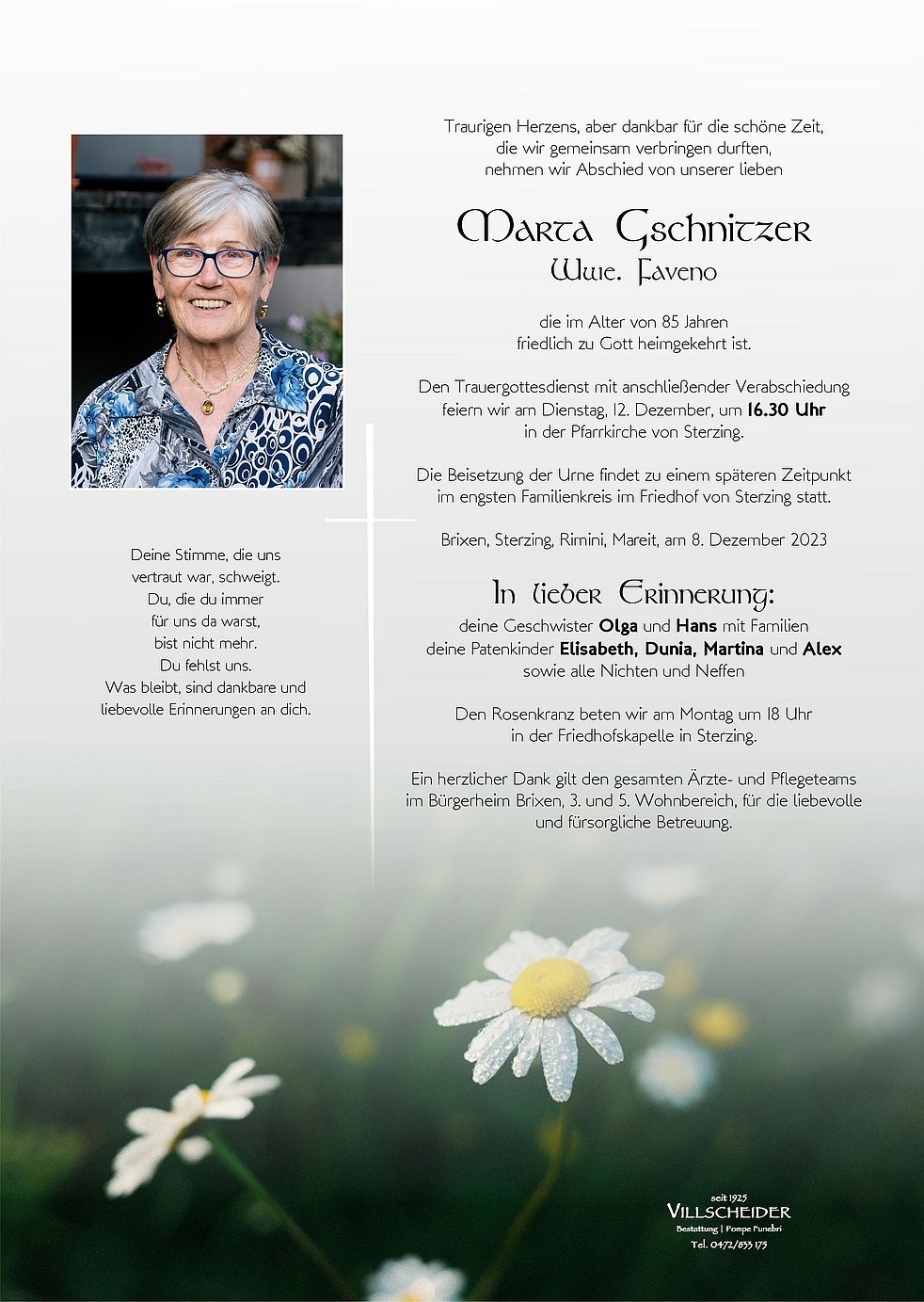 Begräbnisgottesdienst: 12.12. - 16:30 Uhr Sterzing