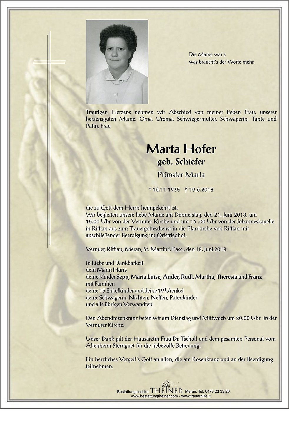 Wir begleiten unsere liebe Mame am Donnerstag, den 21. Juni 2018, um 15.00 Uhr von der Vernurer Kirche und um 16 .00 Uhr von der Johanneskapelle in Riffian aus zum Trauergottesdienst in die Pfarrkirche von Riffian mit anschließender Beerdigung im Ortsfriedhof.