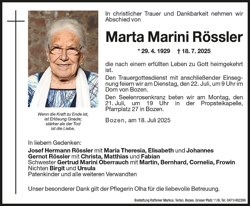 Den Trauergottesdienst mit anschließender Einsegnung feiern wir am Dienstag, den 22. Juli, um 9 Uhr im Dom von Bozen.