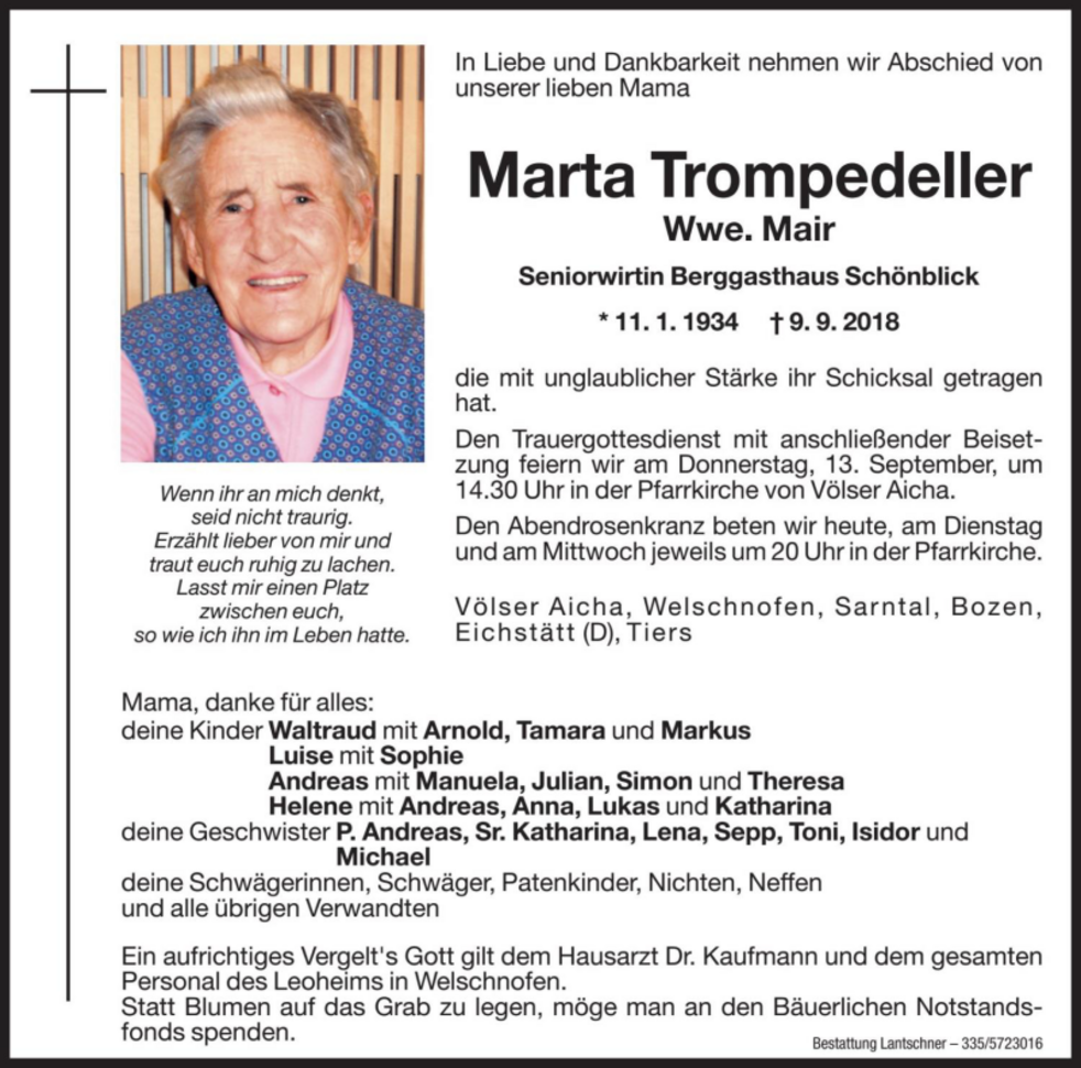Den Trauergottesdienst mit anschließender Beisetzung feiern wir am Donnerstag,