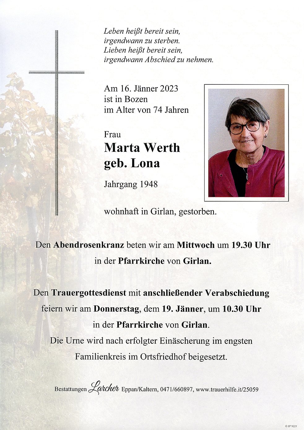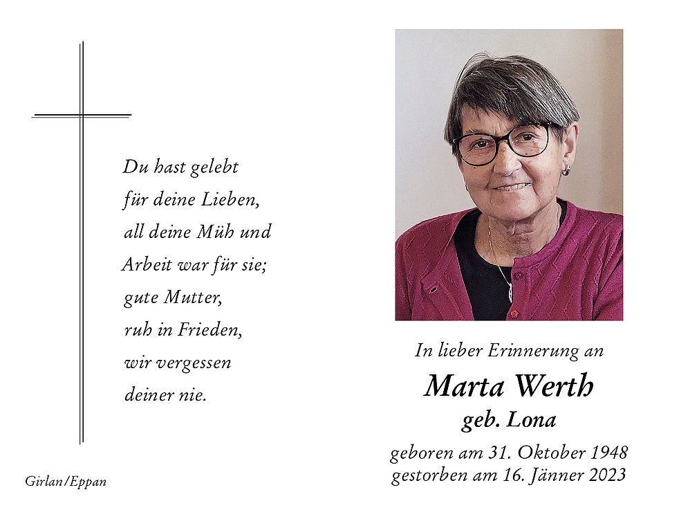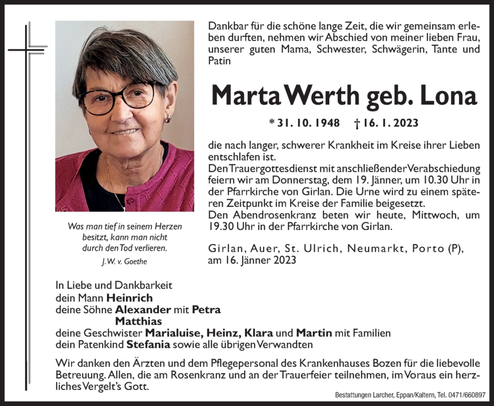 Den Trauergottesdienst mit anschließender Verabschiedung feiern wir am Donnerstag, dem 19. Jänner um 10.30 Uhr in der Pfarrkirche von Girlan. Die Urne wird zu einem späteren Zeitpunkt im Kreise der Familie beigesetzt.