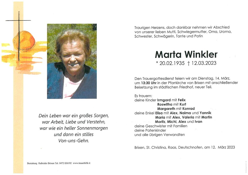Den Trauergottesdienst feiern wir am Dienstag, 14. März, um 13:30 Uhr in der Pfarrkirche von Brixen mit anschließender Beisetzung im städtischen Friedhof, neuer Teil.