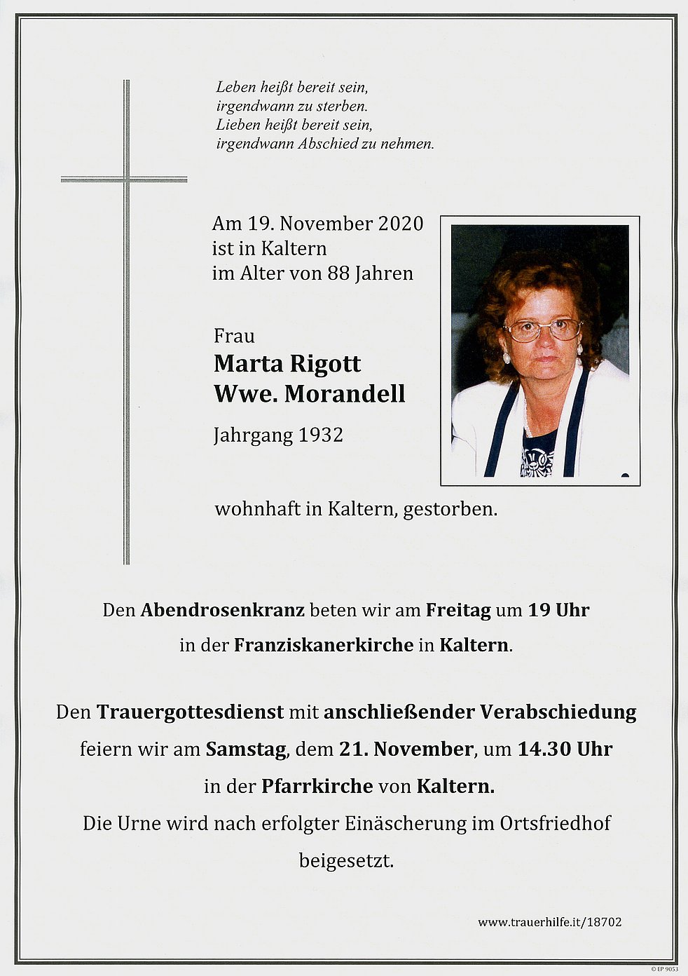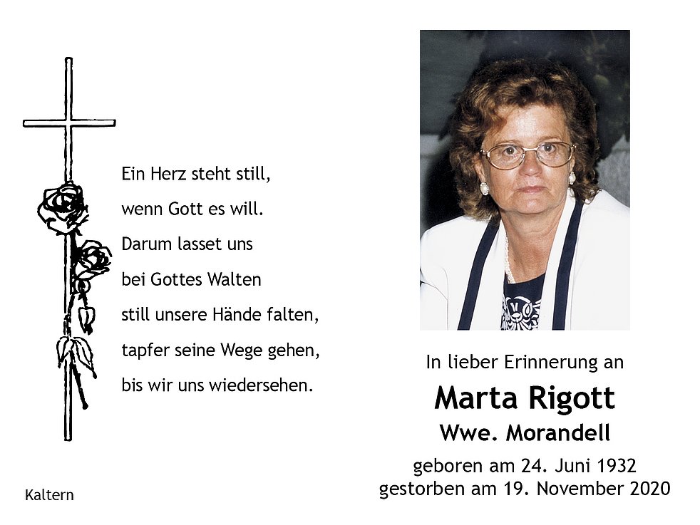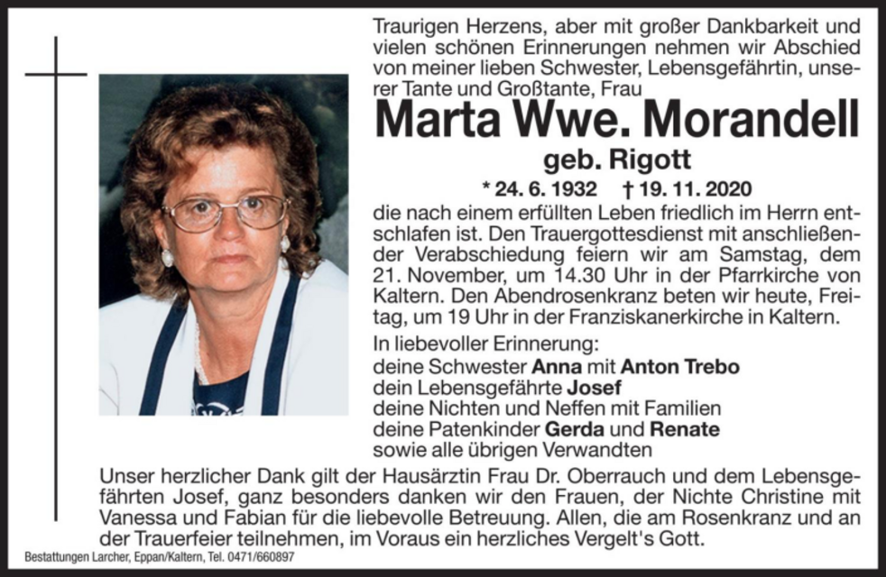 Den Trauergottesdienst mit anschließender Verabschiedung feiern wir am Samstag, dem 21. November um 14.30 Uhr in der Pfarrkirche von Kaltern.