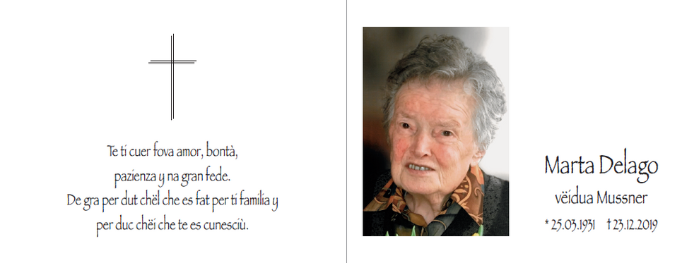 Wir danken ganz besonders dem Pflegepersonal der Cësa San Durich für die jahrelange und liebevolle Pflege.