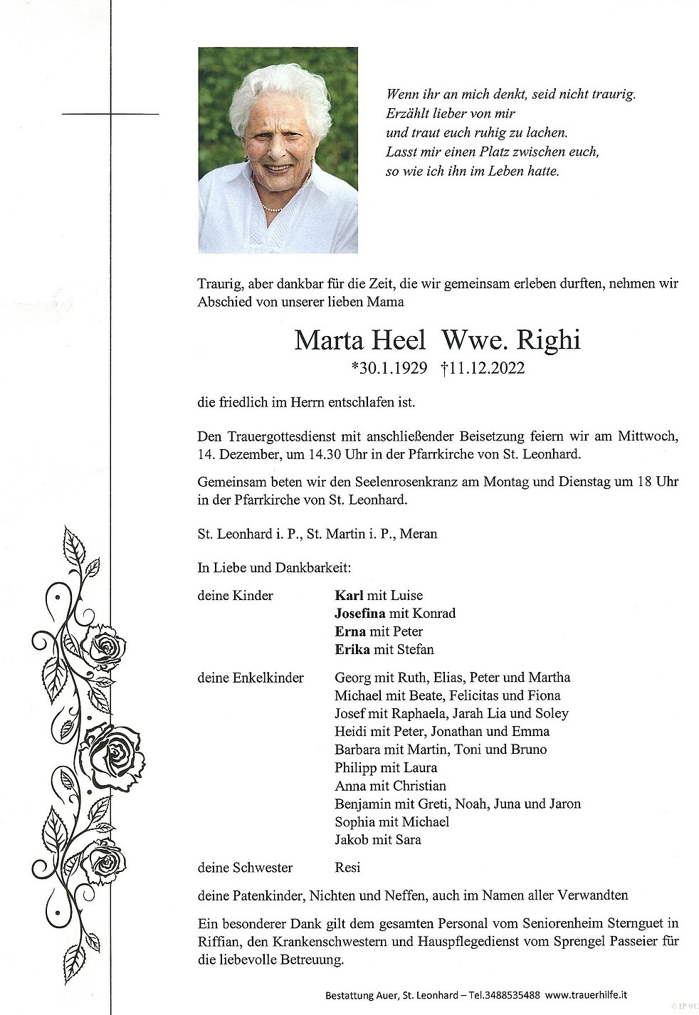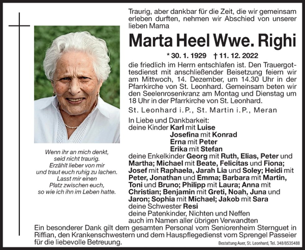 Ein besonderer Dank gilt dem gesamten Personal vom Seniorenheim Sternguet in Riffian, den Krankenschwestern und Hauspflegedienst vom Sprengel Passeier für die liebevolle Betreuung.