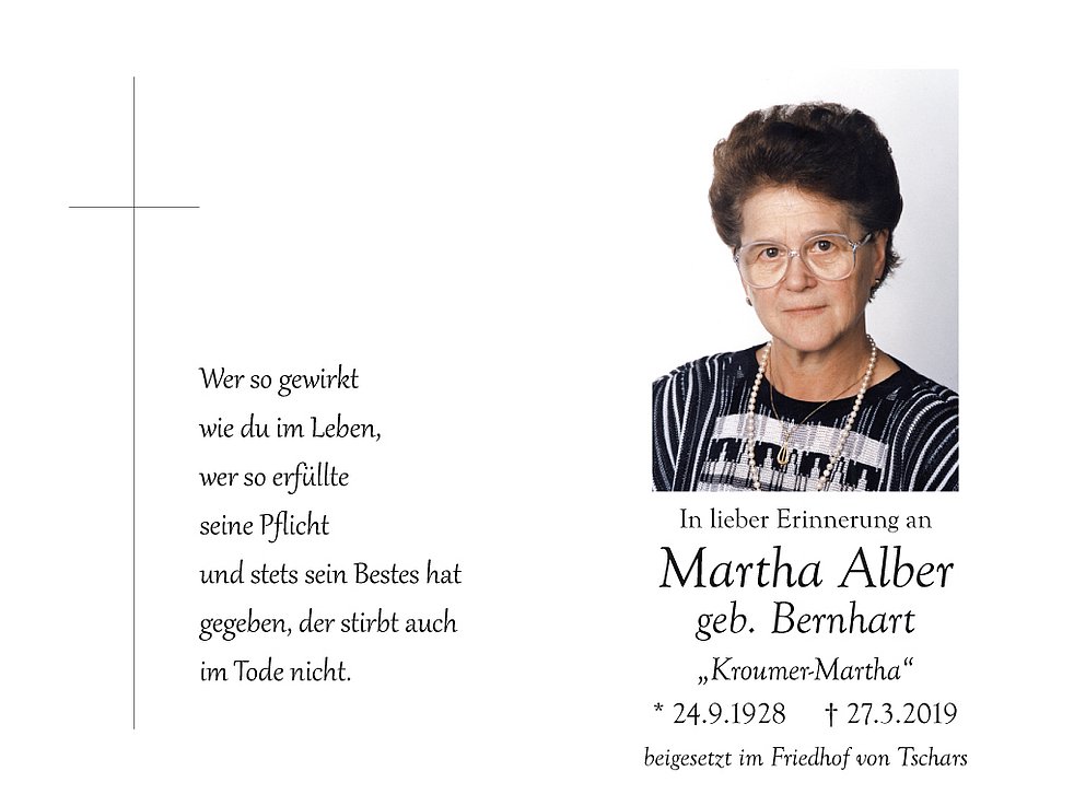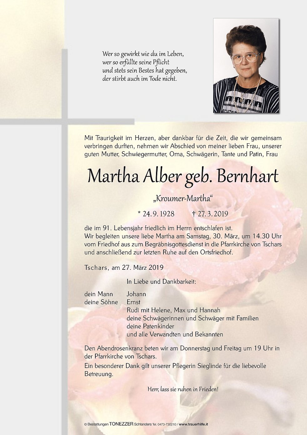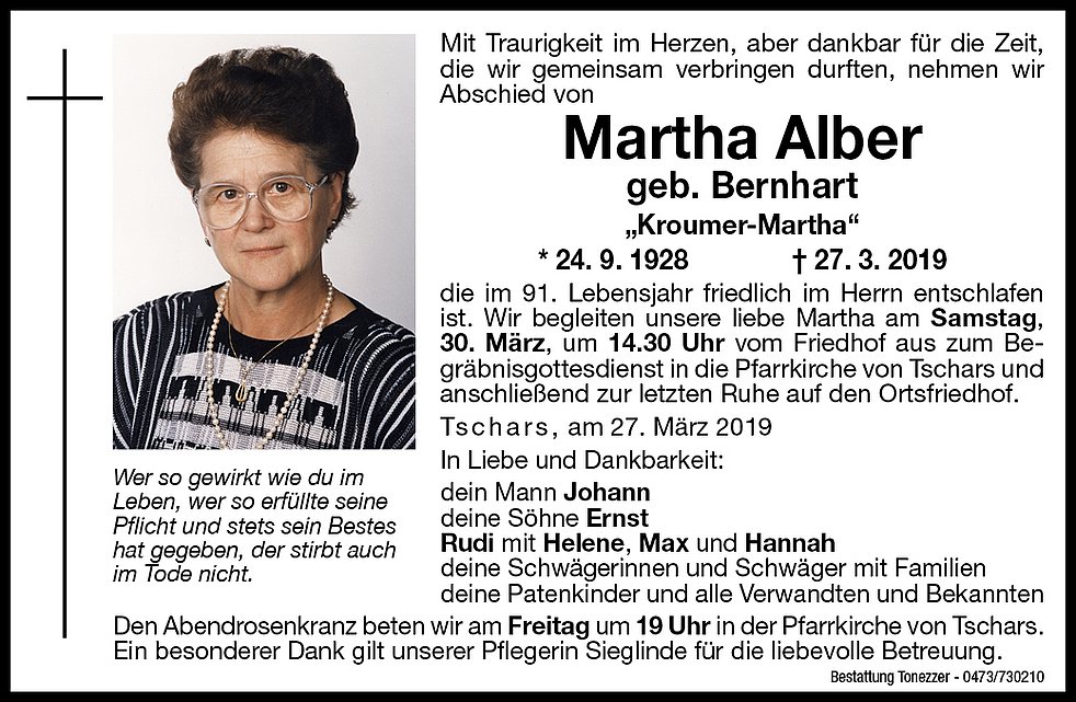 Wir begleiten unsere liebe Martha am Samstag, 30. März, um 14.30 Uhr vom Friedhof aus zum Begräbnisgottesdienst in die Pfarrkirche von Tschars und anschließend zur letzten Ruhe auf den Ortsfriedhof.