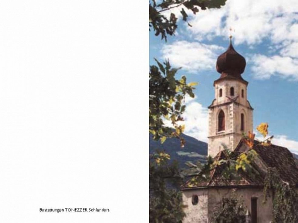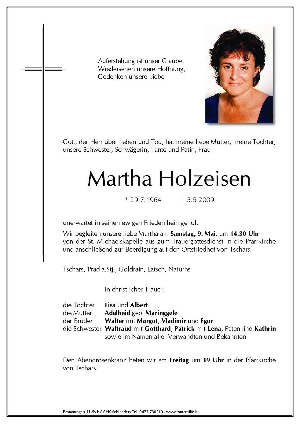 Wir begleiten unsere liebe Martha am Samstag, 9. Mai, um 14.30 Uhr von der St. Michaelskapelle aus zum Trauergottesdienst in die Pfarrkirche und anschließend zur Beerdigung auf den Ortsfriedhof von Tschars.