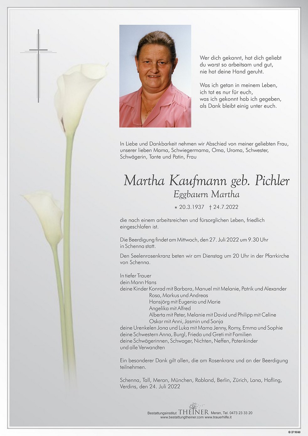 Die Beerdigung findet am Mittwoch, den 27. Juli 2022 um 9.30 Uhr in Schenna statt.