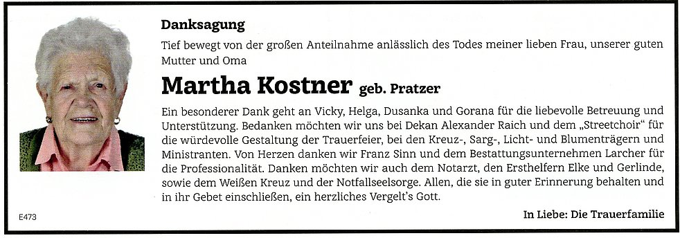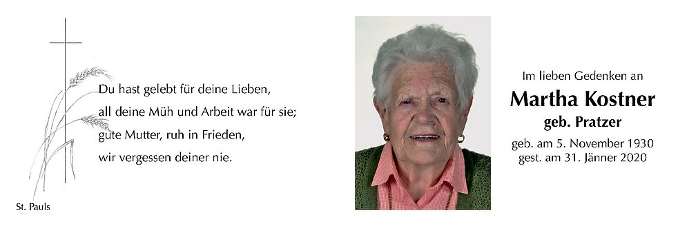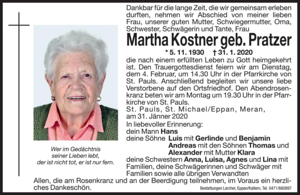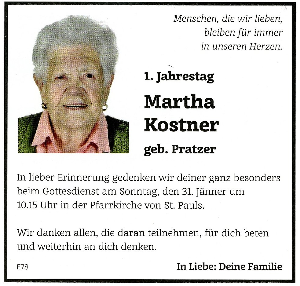 Den Trauergottesdienst feiern wir am Dienstag, dem 4. Februar um 14.30 Uhr in der Pfarrkirche von St. Pauls. Anschließend begleiten wir unsere liebe Verstorbene auf den Ortsfriedhof.