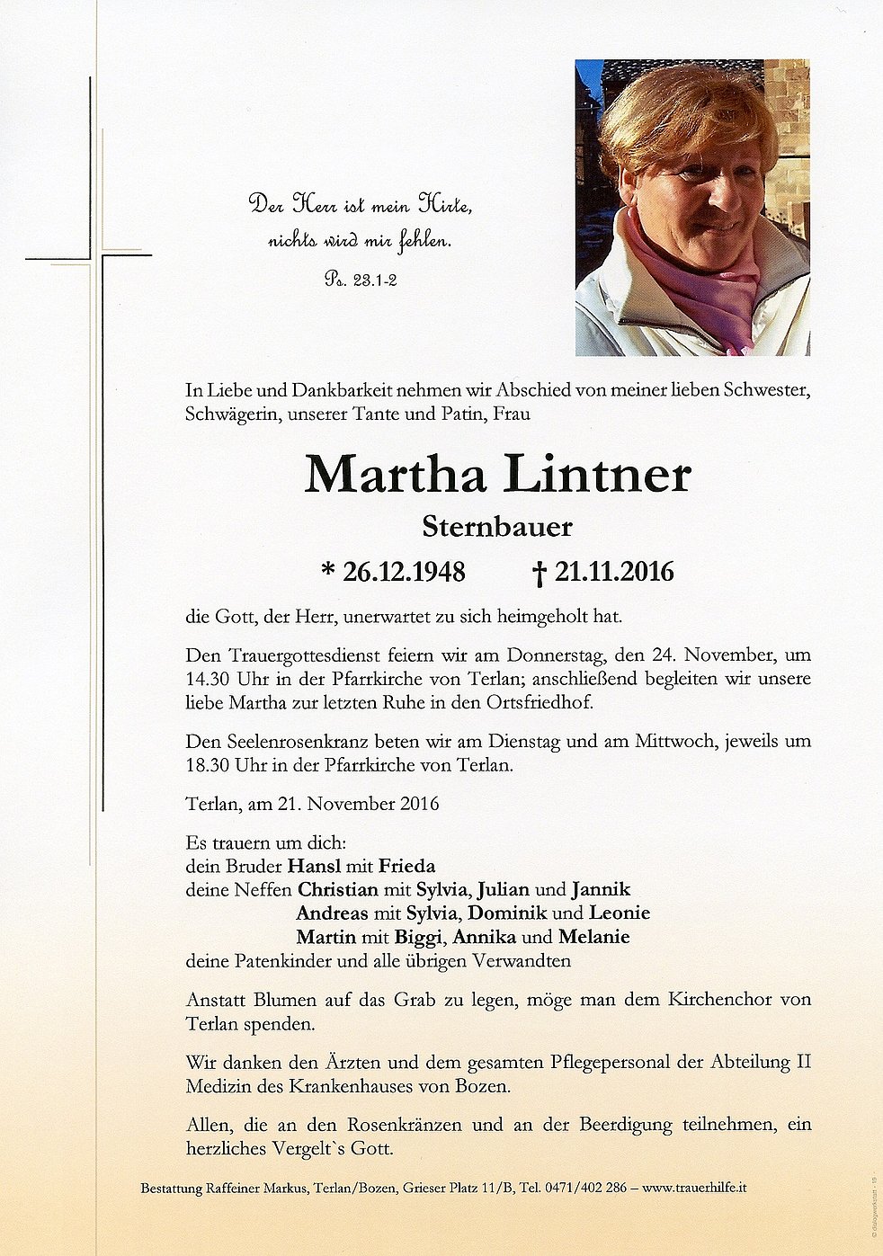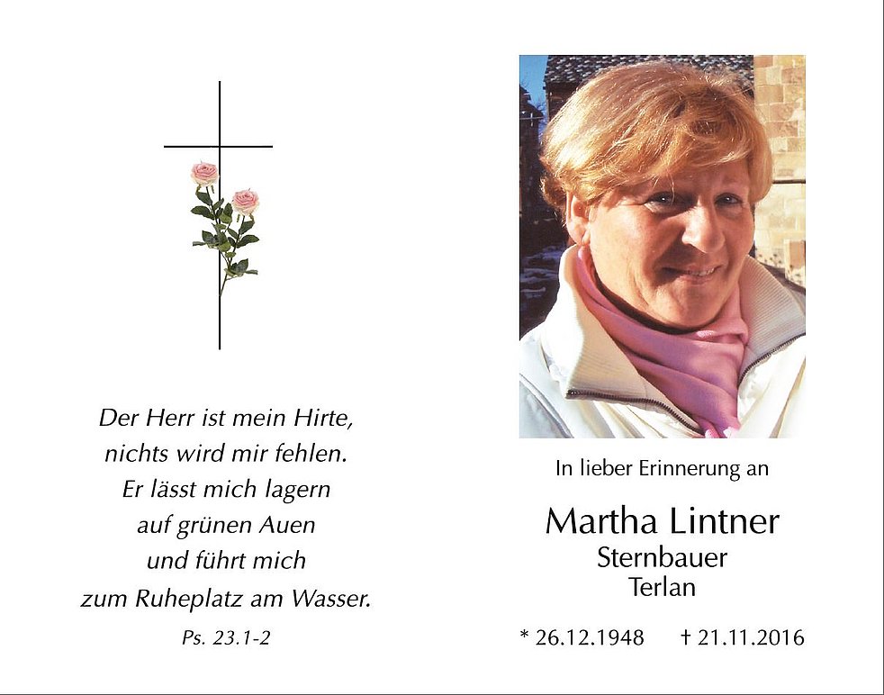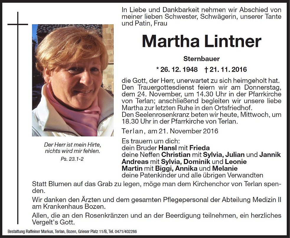 Den Trauergottesdienst feiern wir am Donnerstag, den 24. November, um 14.30 Uhr in der Pfarrkirche von Terlan; anschließend begleiten wir unsere liebe Martha zur letzten Ruhe in den Ortsfriedhof.