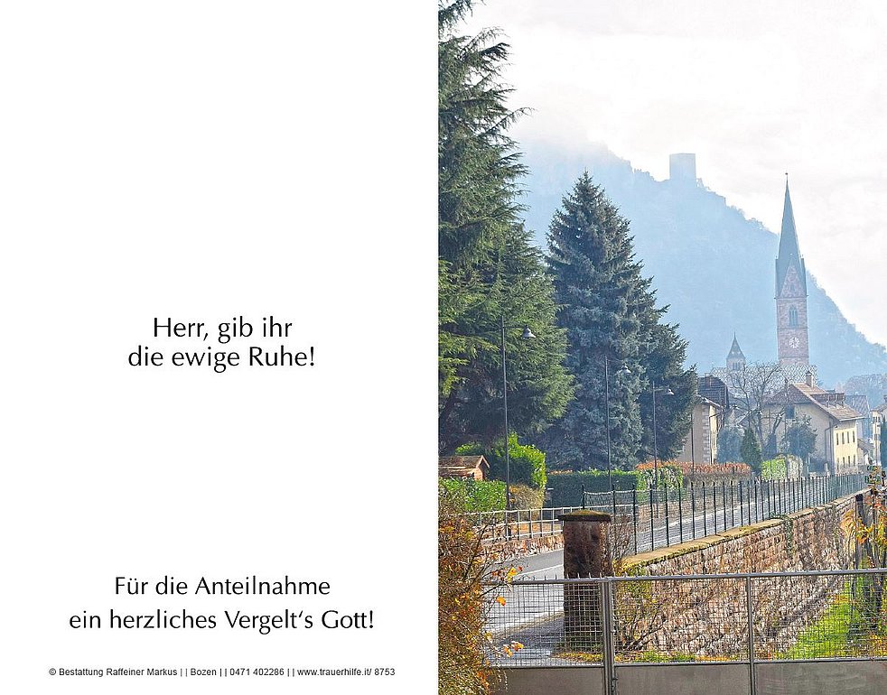 Anstatt Blumen auf das Grab zu legen, möge man dem Kirchenchor von Terlan spenden.