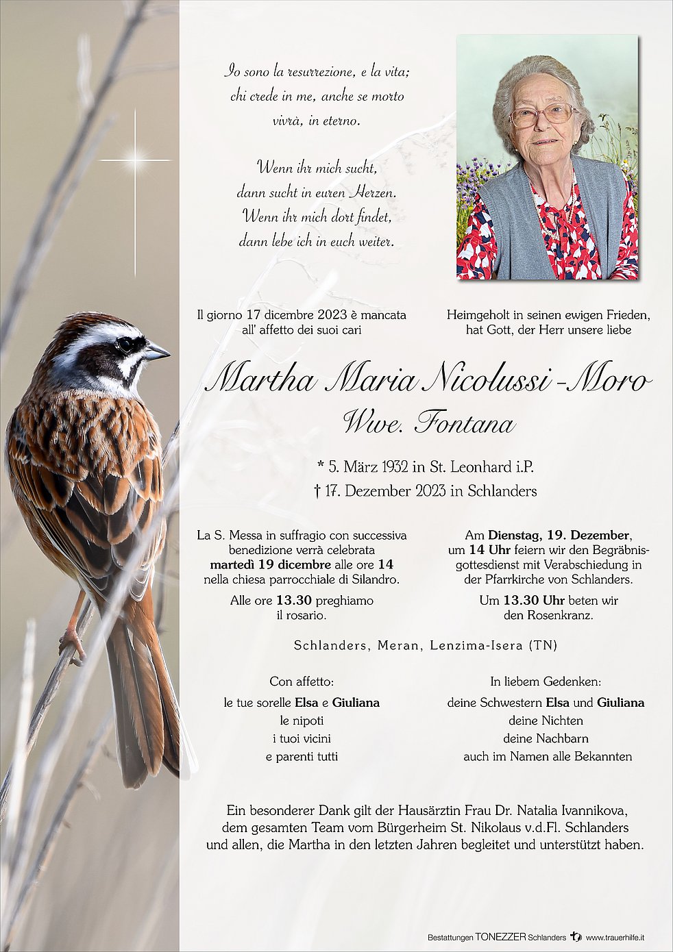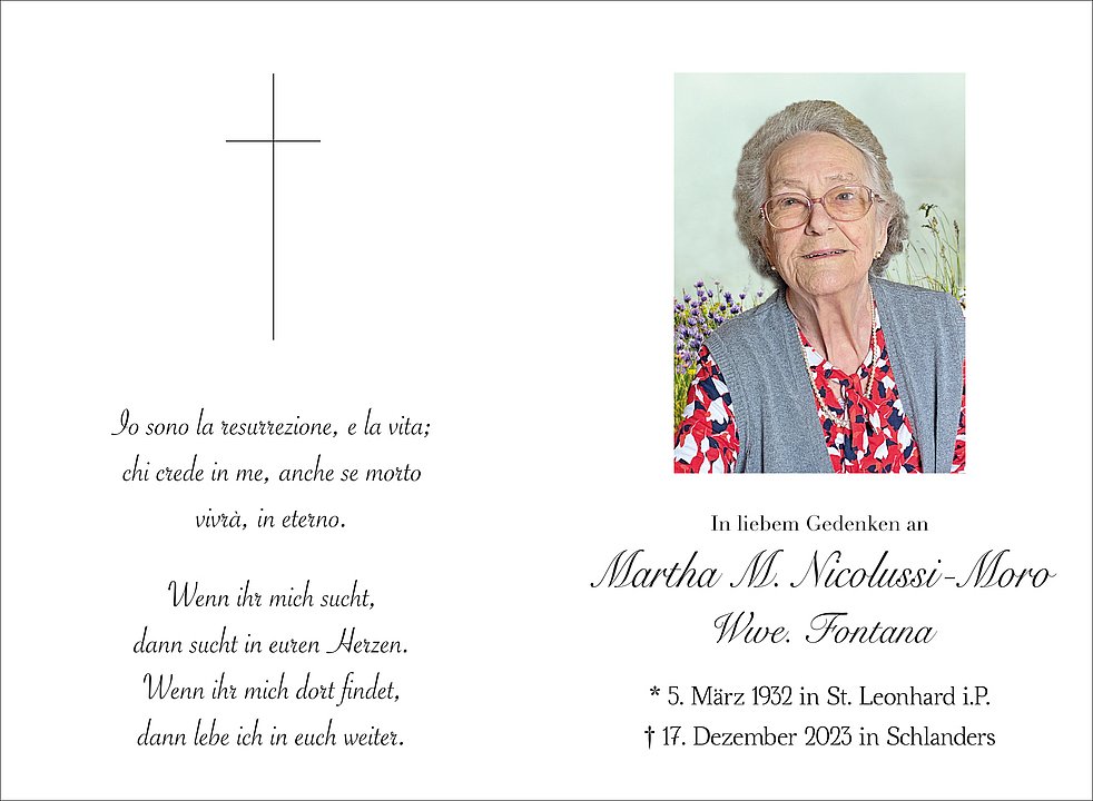 Ein besonderer Dank gilt der Hausärztin Frau Dr. Natalia Ivannikova, dem gesamten Team vom Bürgerheim St. Nikolaus v.d.Fl. Schlanders und allen, die Martha in den letzten Jahren begleitet und unterstützt haben.