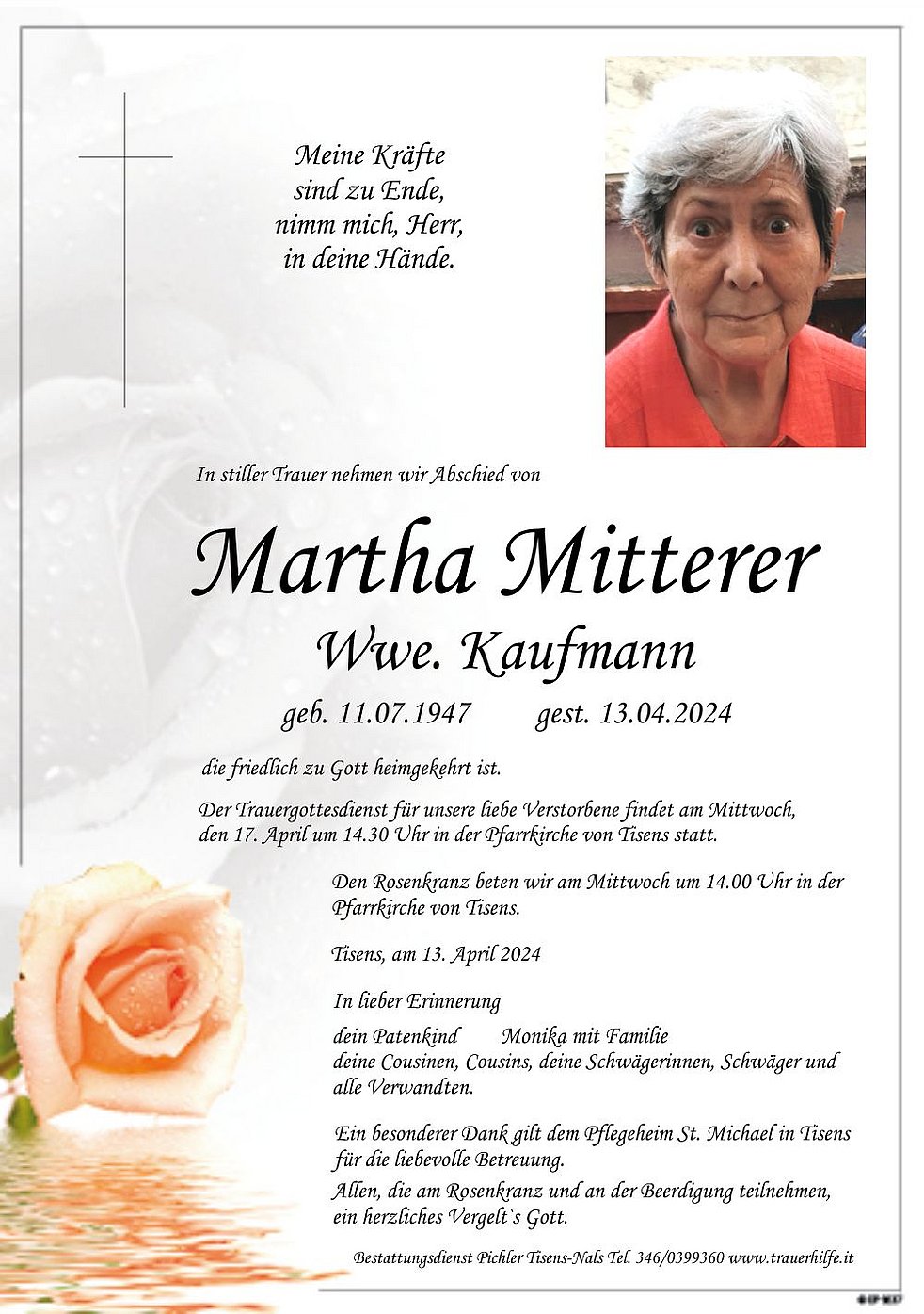 Begräbnisgottesdienst: 17.04. - 14:30 Uhr Pfarrkirche Tisens