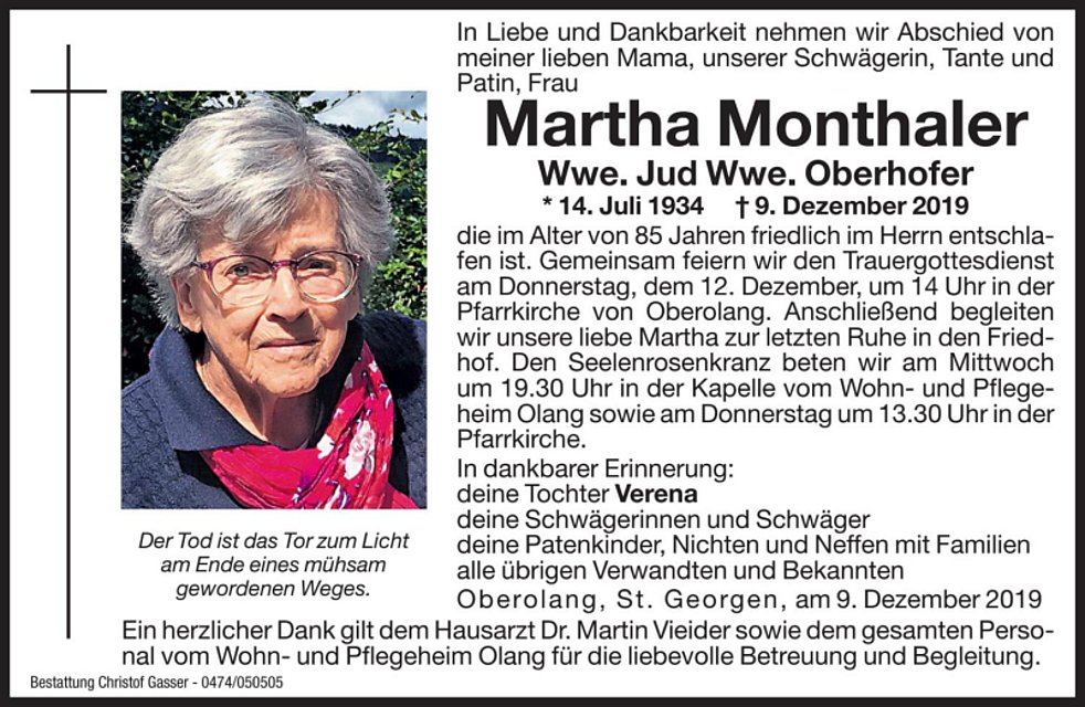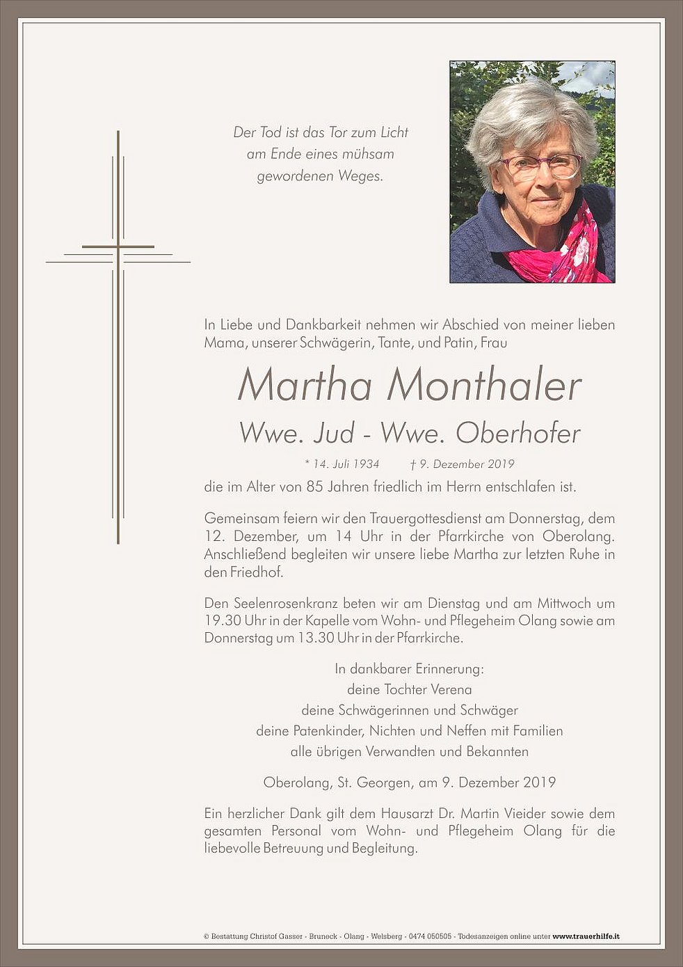 Gemeinsam feiern wir den Trauergottesdienst am Donnerstag, dem 12. Dezember, um 14 Uhr in der Pfarrkirche von Oberolang. Anschließend begleiten wir unsere liebe Martha zur letzten Ruhe in den Friedhof.