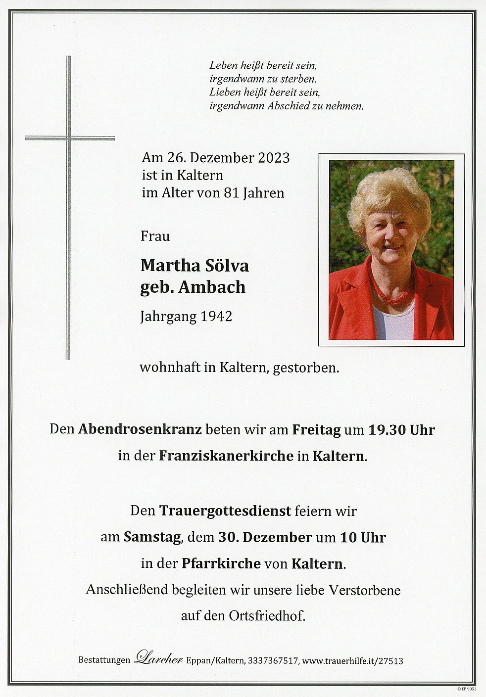 Wir begehen den Trauergottesdienst am Samstag, dem 30.Dezember um 10 Uhr in der Pfarrkirche von Kaltern und begleiten anschließend unsere liebe Verstorbene auf den Ortsfriedhof.