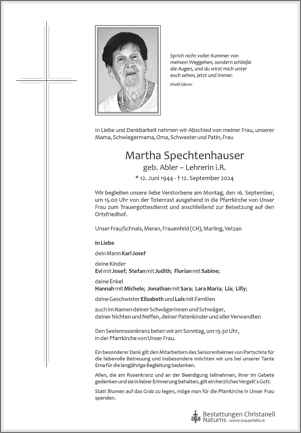 Wir begleiten unsere liebe Verstorbene am Montag, den 16. September, um 15.00 Uhr von der Totenrast ausgehend in die Pfarrkirche von Unser Frau zum Trauergottesdienst und anschließend zur Beisetzung auf den Ortsfriedhof.
