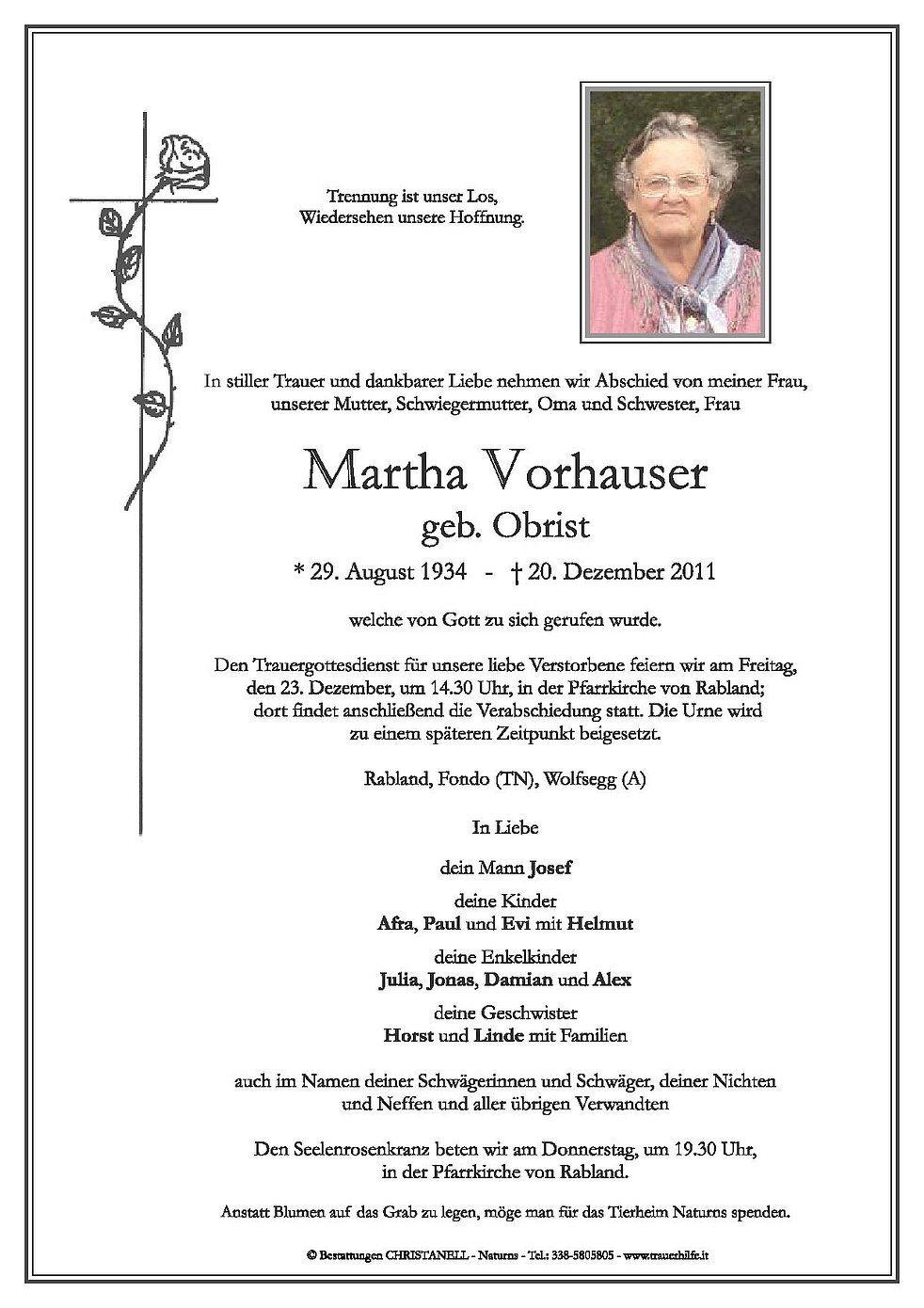 Den Trauergottesdienst für unsere liebe Verstorbene feiern wir am Freitag, den 23. Dezember, um 14.30 Uhr, in der Pfarrkirche von Rabland; dort findet anschließend die Verabschiedung statt. Die Urne wird zu einem späteren Zeitpunkt beigesetzt.