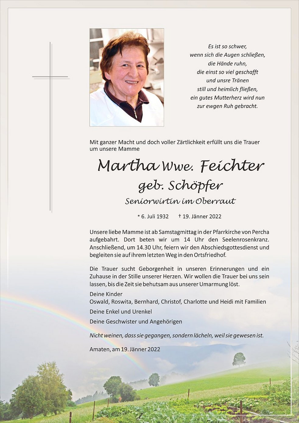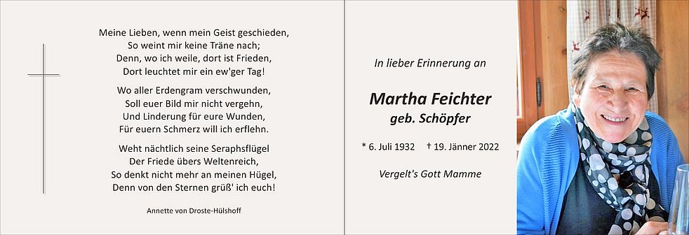 Unsere liebe Mamme ist ab Samstagmittag in der Pfarrkirche von Percha aufgebahrt. Dort beten wir um 14 Uhr den Seelenrosenkranz. Anschließend, um 14.30 Uhr, feiern wir den Abschiedsgottesdienst und begleiten sie auf ihrem letzten Weg in den Ortsfriedhof.