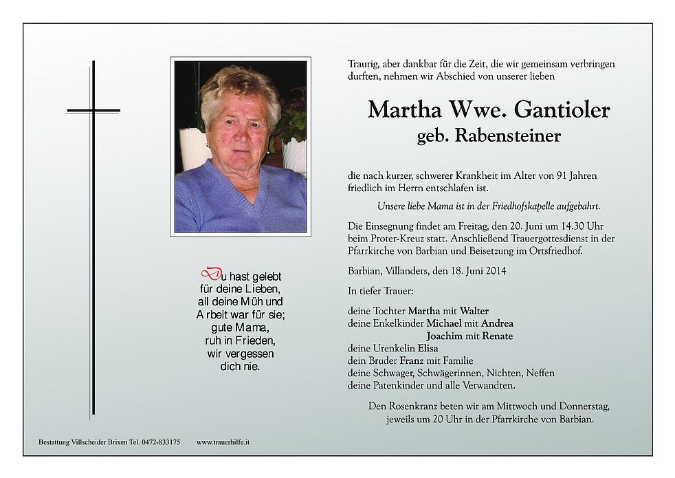 beim Proter-Kreuz statt. Anschließend Trauergottesdienst in der Pfarrkirche von Barbian und Beisetzung im Ortsfriedhof.