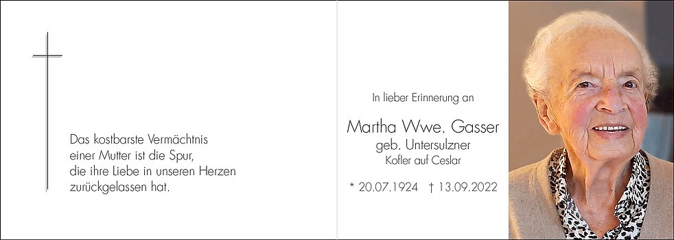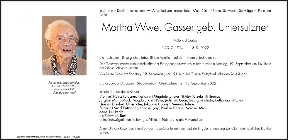 Den Trauergottesdienst mit anschließender Einsegnung unserer Mutti feiern wir am Montag, 19. September, um 14 Uhr in der Grieser Stiftspfarrkirche.