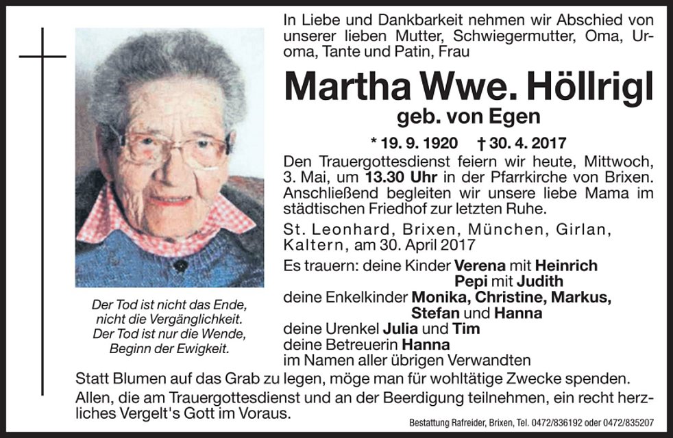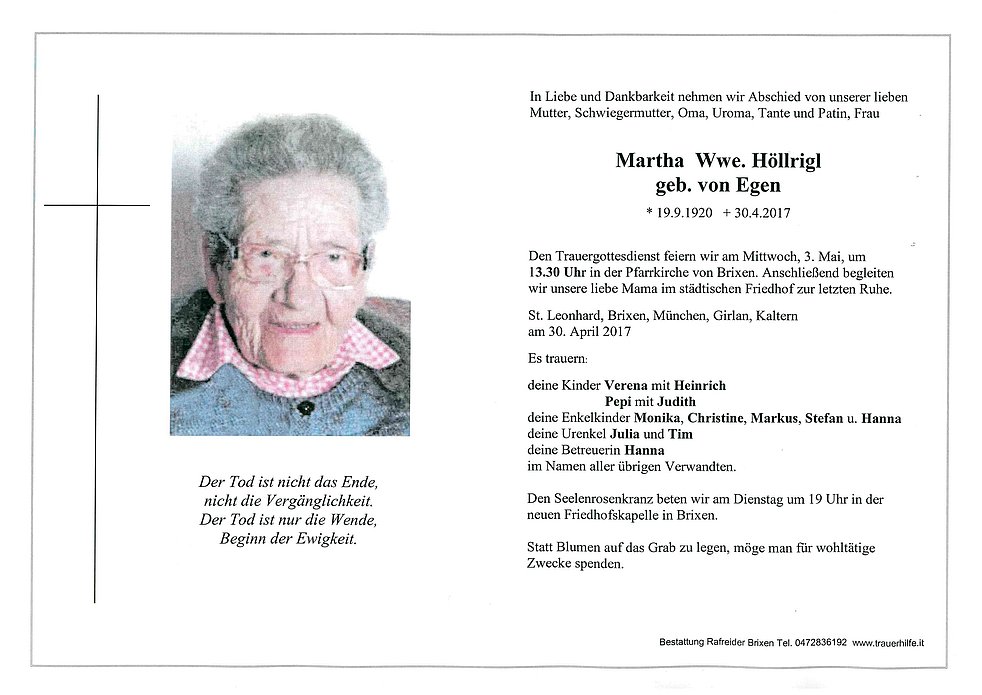 Den Trauergottesdienst feiern wir am Mittwoch, 3. Mai, um 13.30 Uhr in der Pfarrkirche von Brixen. Anschließend begleiten wir unsere liebe Mama im städtischen Friedhof zur letzten Ruhe.