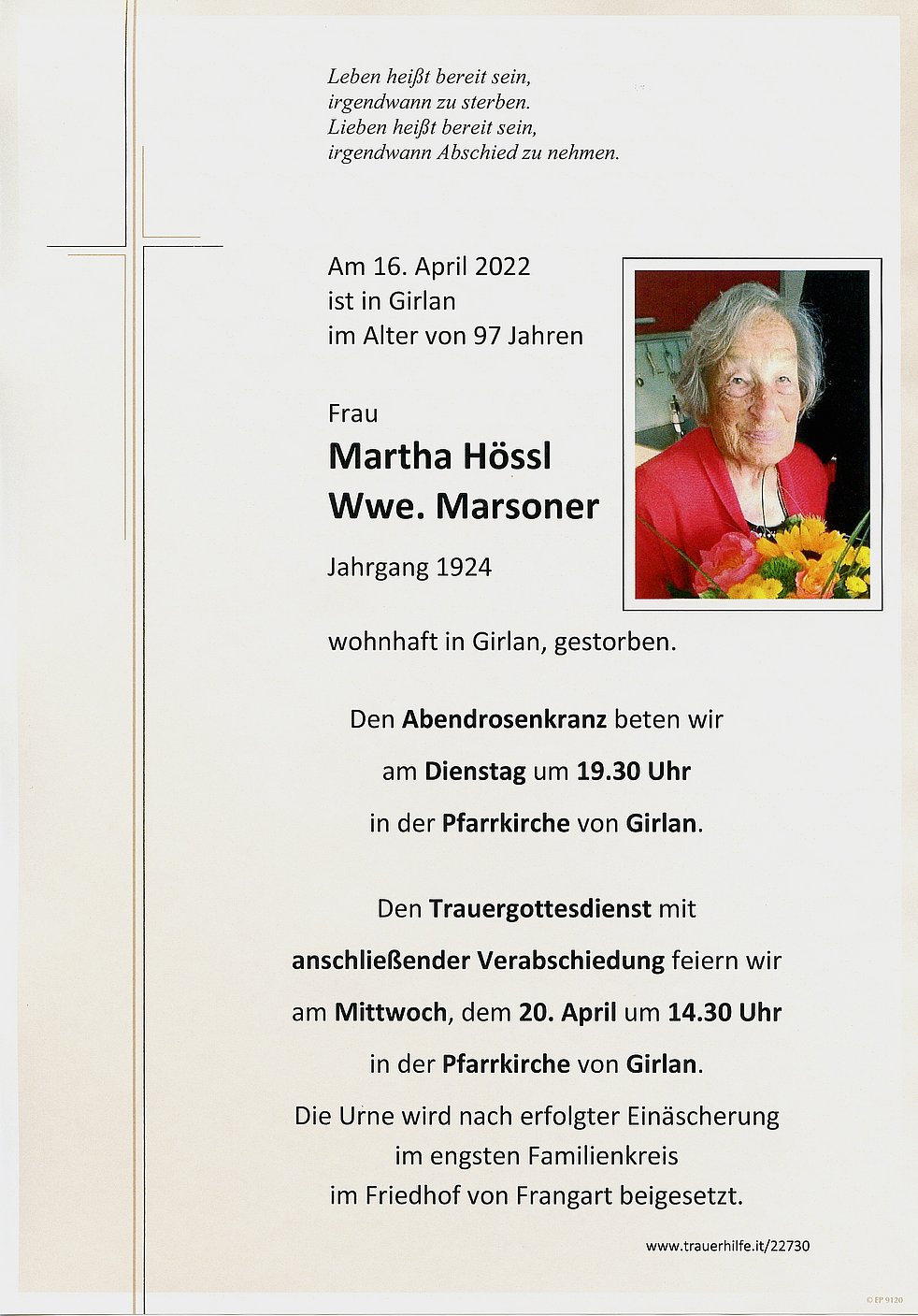 am Mittwoch, 20. April, um 14.30 Uhr findet ebenfalls in der Pfarrkirche Girlan der Trauergottesdienst mit Verabschiedung statt.