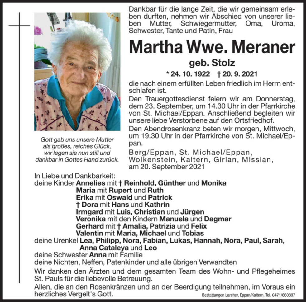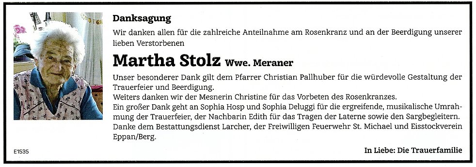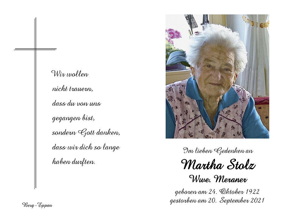 Den Trauergottesdienst feiern wir am Donnerstag, dem 23. September um 14.30 Uhr in der Pfarrkirche von St. Michael/Eppan. Anschließend begleiten wir unsere liebe Verstorbene auf den Ortsfriedhof.