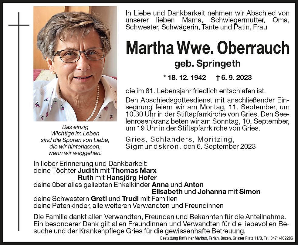 Ein besonderer Dank gilt allen Freundinnen und Verwandten für die liebevollen Besuche und der Krankenpflege Gries für die gewissenhafte Betreuung.
