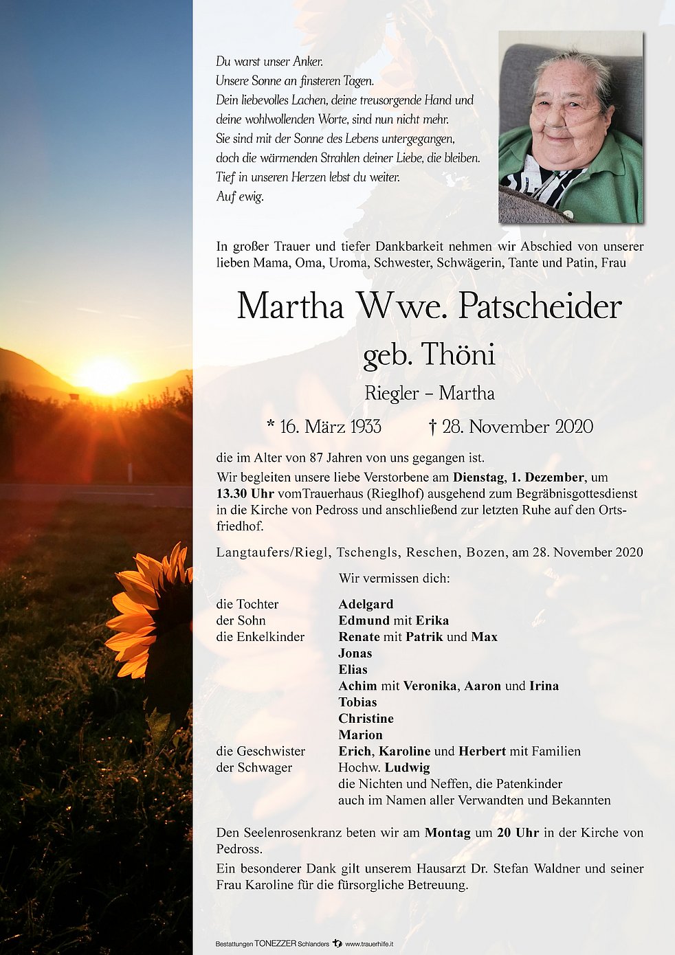 Wir begleiten unsere liebe Verstorbene am Dienstag, 1. Dezember, um 13.30 Uhr vom Trauerhaus (Rieglhof) ausgehend zum Begräbnisgottesdienst in die Kirche von Pedross und anschließend zur letzten Ruhe auf den Ortsfriedhof.