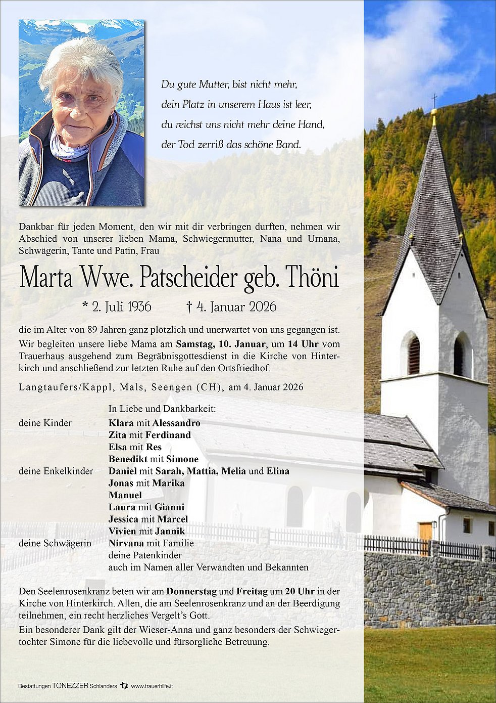 Wir begleiten unsere liebe Mama am Samstag, 10. Januar, um 14 Uhr vom Trauerhaus ausgehend zum Begräbnisgottesdienst in die Kirche von Hinterkirch und anschließend zur letzten Ruhe auf den Ortsfriedhof.