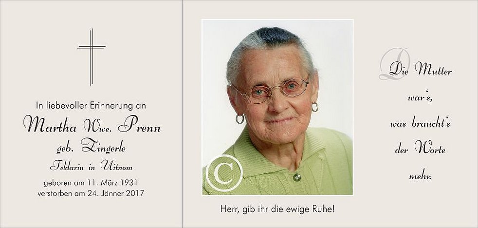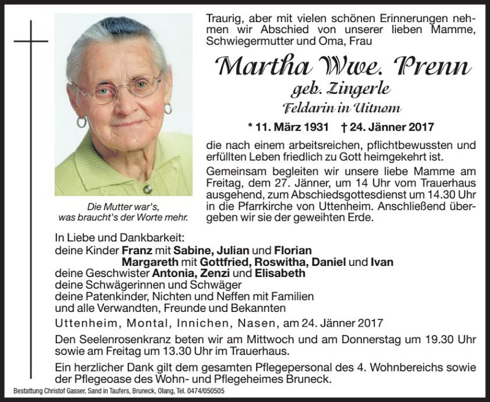 Gemeinsam begleiten wir unsere liebe Mamme am Freitag, dem 27. Jänner, um 14 Uhr vom Trauerhaus ausgehend, zum Abschiedsgottesdienst um 14.30 Uhr in die Pfarrkirche von Uttenheim. Anschließend übergeben wir sie der geweihten Erde.