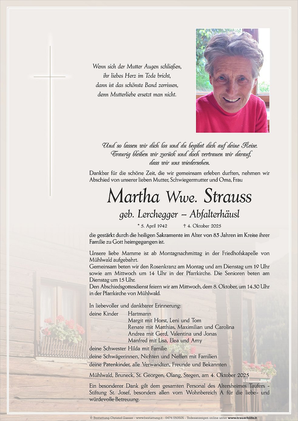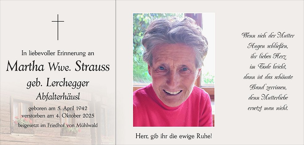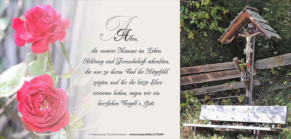 Unsere liebe Mamme ist ab Montagnachmittag in der Friedhofskapelle von Mühlwald aufgebahrt.