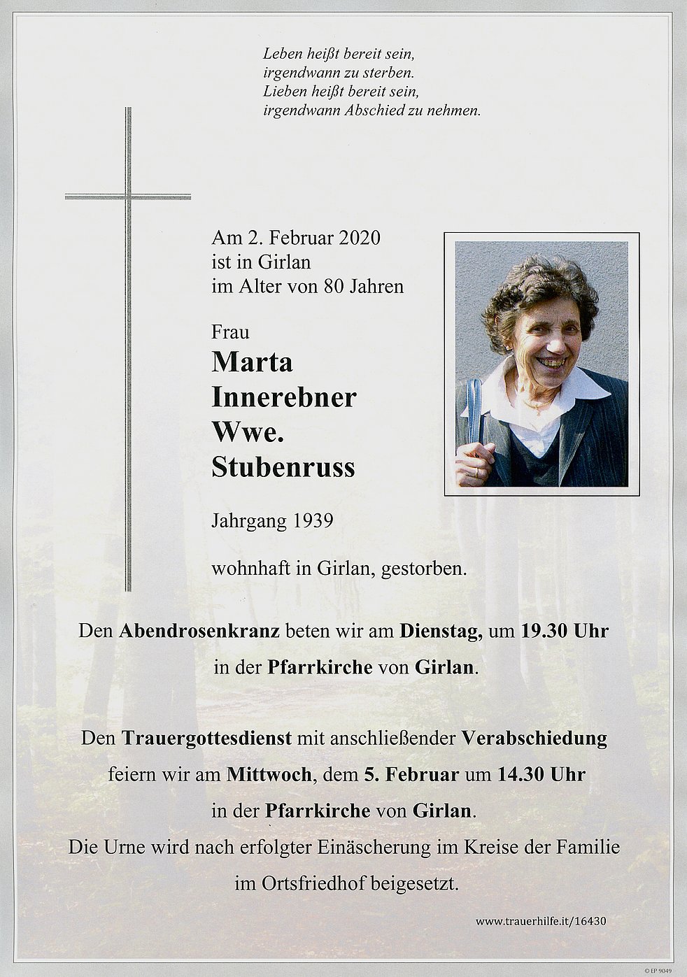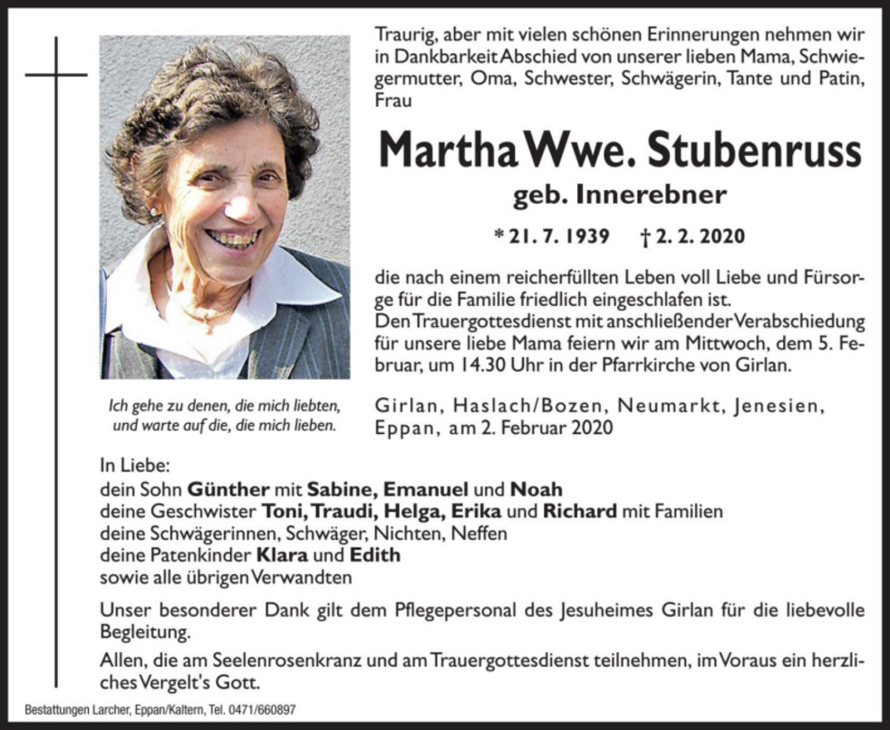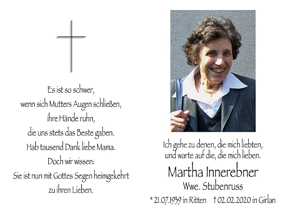 Den Trauergottesdienst mit anschließender Verabschiedung für unsere liebe Mama feiern wir am Mittwoch, dem 5. Februar um 14.30 Uhr in der Pfarrkirche von Girlan.