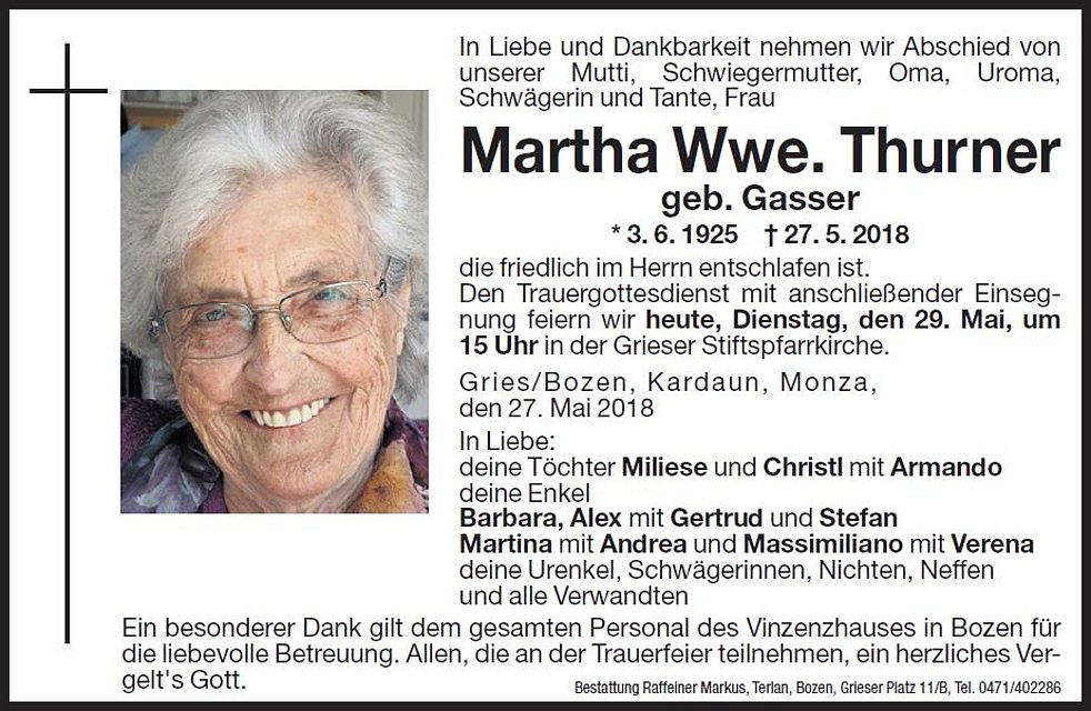Den Trauergottesdienst mit anschlieβender Einsegnung feiern wir am Dienstag, dem 29. Mai, um 15 Uhr in der Grieser Stiftspfarrkirche.