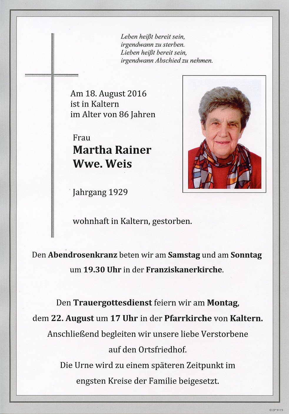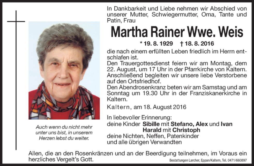 Den Trauergottesdienst feiern wir am Montag, dem 22. August um 17 Uhr in der Pfarrkirche von Kaltern. Anschließend begleiten wir unsere liebe Verstorbene auf den Ortsfriedhof.