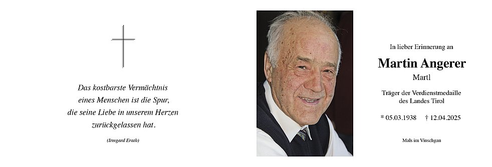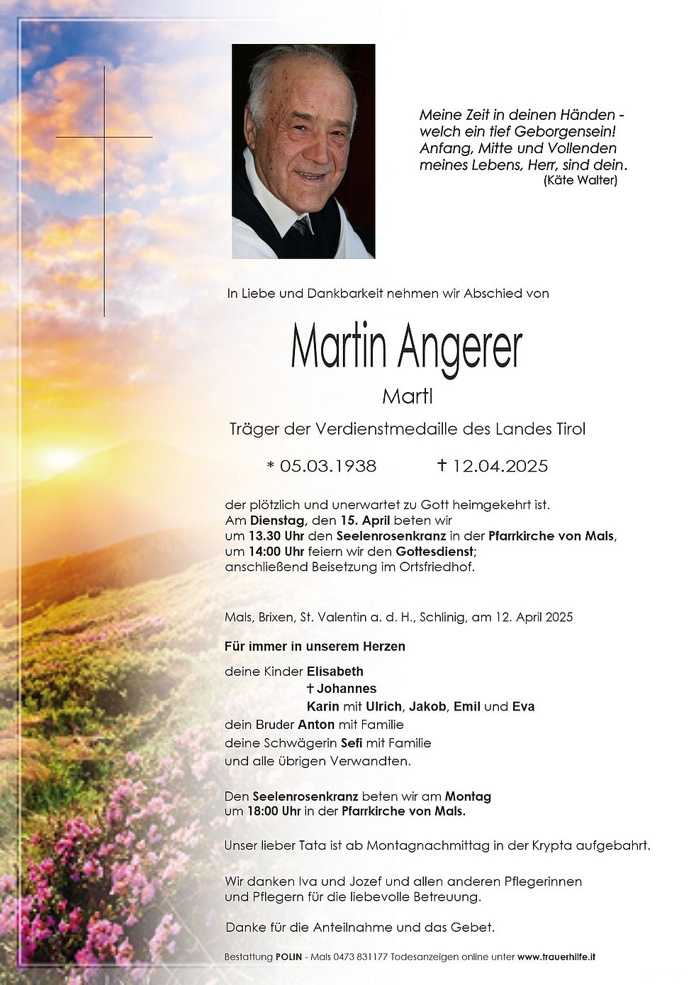 Geboren in Schlinig am 5. März 1938 als sechstes Kind von Veith und Marianne Angerer. Nach einer Lehre als Maurer und nach erster Berufstätigkeit machte er sich 1967 als Maurermeister selbständig und führte bis zum Jahr 2000 ein eigenes Bauunternehmen in Mals. In dieser Zeit realisierte er zahlreiche Bauprojekte auch in Zusammenarbeit mit dem Landesdenkmalamt. Eine gute Ausbildung der Lehrlinge war ihm stets ein besonderes Anliegen.
