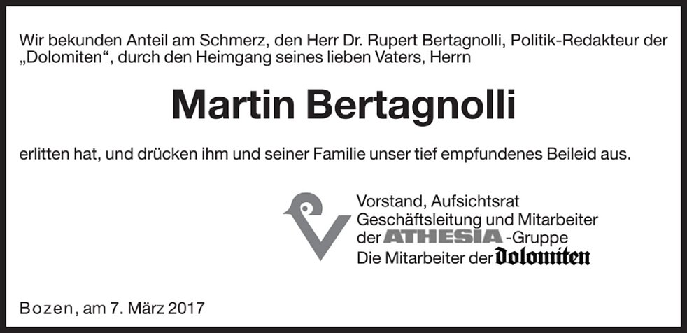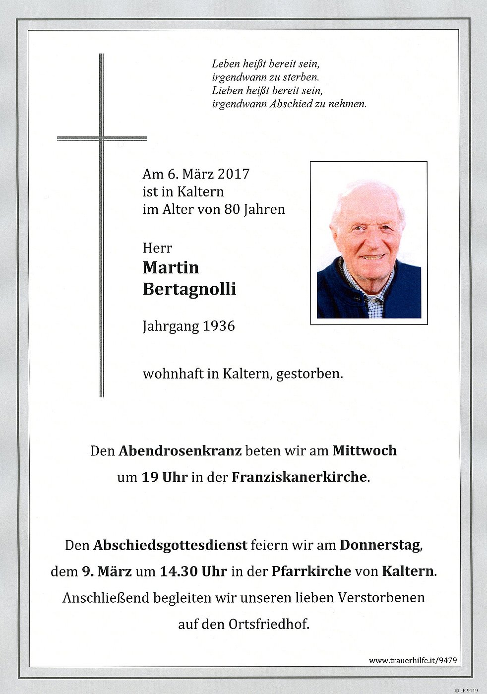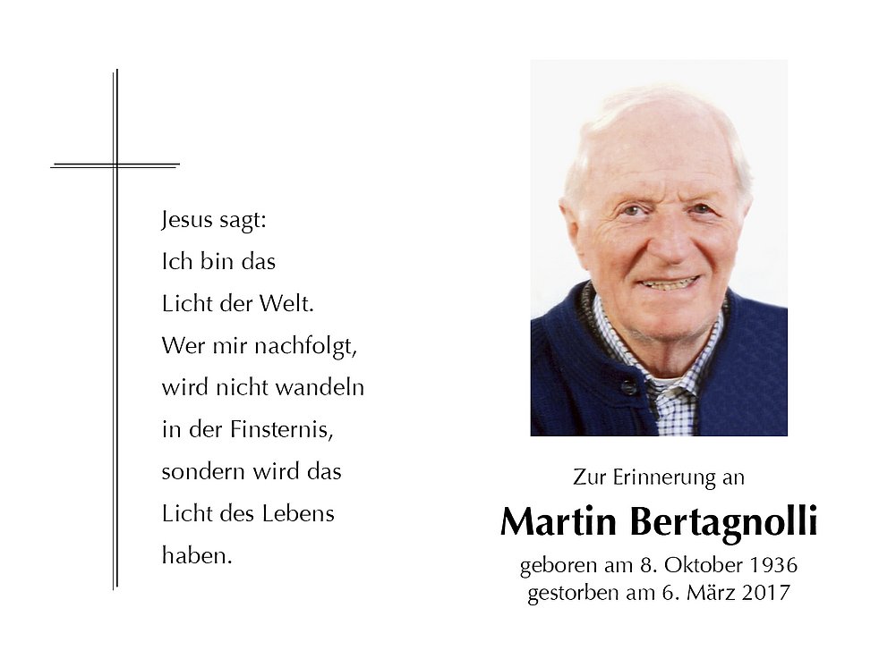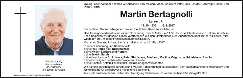 Den Trauergottesdienst feiern wir am Donnerstag, dem 9. März um 14.30 Uhr in der Pfarrkirche von Kaltern. Anschließend begleiten wir unseren lieben Verstorbenen auf den Ortsfriedhof.