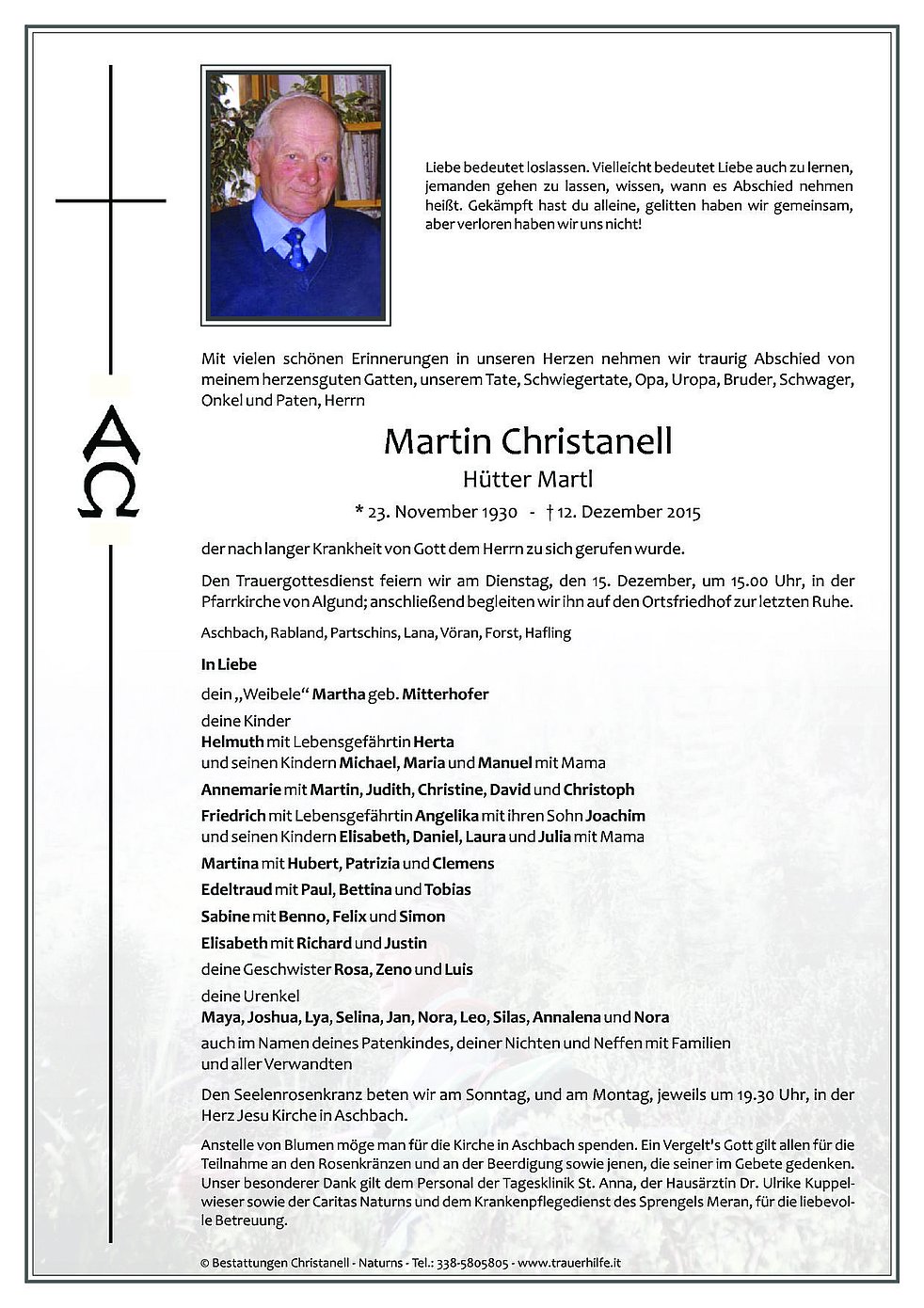 Den Trauergottesdienst feiern wir am Dienstag, den 15. Dezember, um 15.00 Uhr, in der Pfarrkirche von Algund; anschließend begleiten wir ihn auf den Ortsfriedhof zur letzten Ruhe.